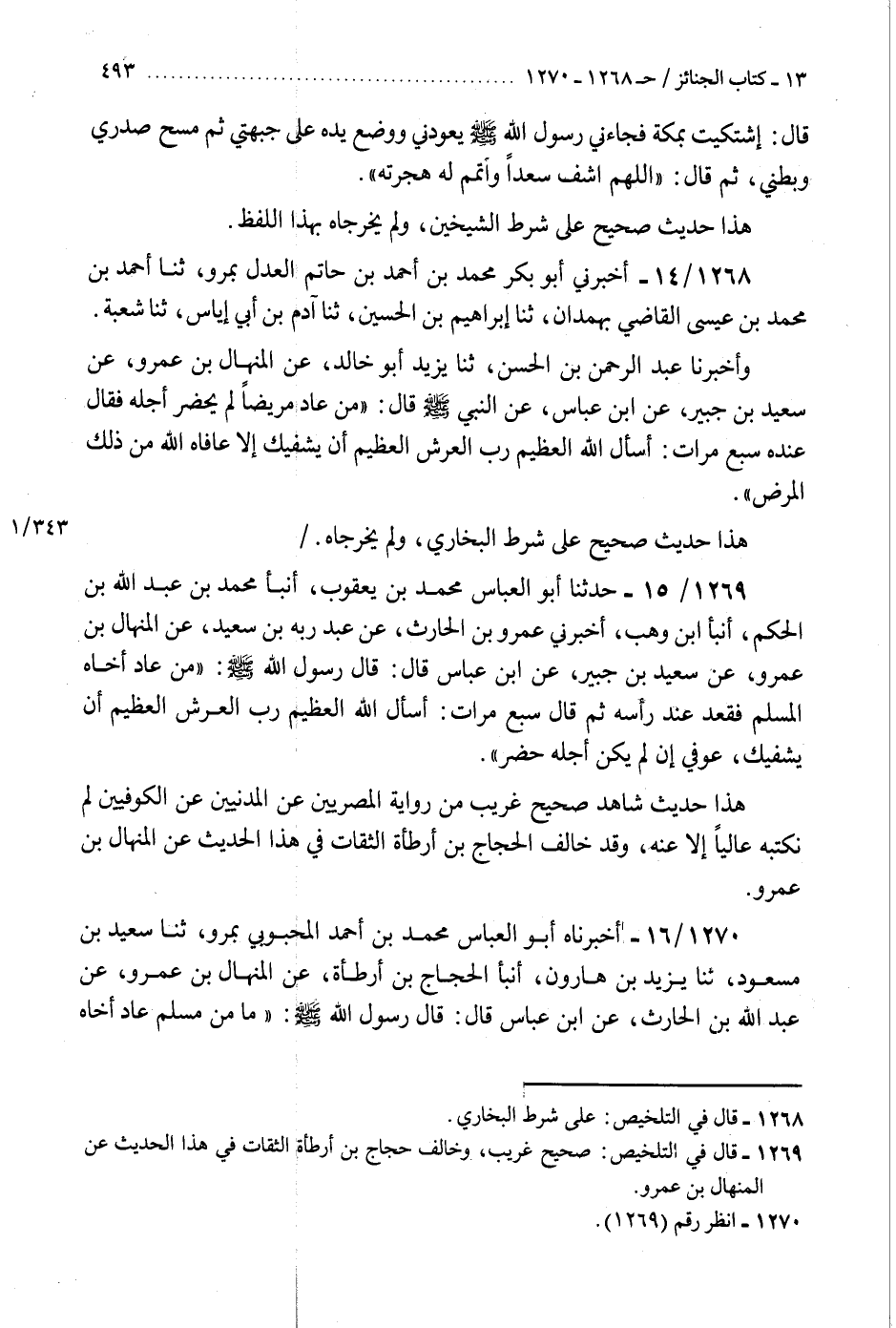 1268 - أَخْبَرَنِي أَبُو بَكْرٍ مُحَمَّدُ بْنُ أَحْمَدَ بْنِ حَاتِمٍ الْعَدْلُ بِمَرْوَ، ثنا أَحْمَدُ بْنُ مُحَمَّدِ بْنِ عِيسَى الْقَاضِي، بِهَمْدَانَ، ثنا إِبْرَاهِيمُ بْنُ الْحُسَيْنِ، ثنا آدَمُ بْنُ أَبِي إِيَاسٍ، ثنا شُعْبَةُ، وَأَخْبَرَنَا عَبْدُ الرَّحْمَنِ بْنُ الْحَسَنِ، ثنا يَزِيدُ أَبُو خَالِدٍ، عَنِ الْمِنْهَالِ بْنِ عَمْرٍو، عَنْ سَعِيدِ بْنِ جُبَيْرٍ، عَنِ ابْنِ عَبَّاسٍ، عَنِ النَّبِيِّ صَلَّى اللهُ عَلَيْهِ وَسَلَّمَ، قَالَ: §" مَنْ عَادَ مَرِيضًا لَمْ يَحْضُرْ أَجَلُهُ، فَقَالَ عِنْدَهُ سَبْعَ مَرَّاتٍ: أَسْأَلُ اللَّهَ الْعَظِيمَ رَبَّ الْعَرْشِ الْعَظِيمِ أَنْ يَشْفِيَكَ إِلَّا عَافَاهُ اللَّهُ مِنْ ذَلِكَ الْمَرَضِ «هَذَا حَدِيثٌ صَحِيحٌ عَلَى شَرْطِ الْبُخَارِيِّ، وَلَمْ يُخَرِّجَاهُ»
