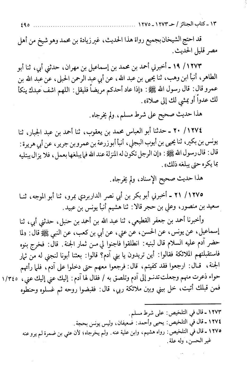 1275 - أَخْبَرَنِي أَبُو بَكْرِ بْنُ أَبِي نَصْرٍ الدَّارَبَرْدِيُّ، بِمَرْوَ، ثنا أَبُو الْمُوَجِّهِ، ثنا سَعِيدُ بْنُ مَنْصُورٍ، وَعَلِيُّ بْنُ حُجْرٍ، قَالَا: ثنا هُشَيْمٌ، أَنْبَأَ يُونُسُ بْنُ عُبَيْدٍ، وَأَخْبَرَنَا أَحْمَدُ بْنُ جَعْفَرٍ الْقَطِيعِيُّ، ثنا عَبْدُ اللَّهِ بْنُ أَحْمَدَ بْنِ حَنْبَلٍ، حَدَّثَنِي أَبِي، ثنا إِسْمَاعِيلُ، عَنْ يُونُسَ، عَنِ الْحَسَنِ، عَنْ عُتَيٍّ، عَنْ أُبَيِّ بْنِ كَعْبٍ، عَنِ النَّبِيِّ صَلَّى اللهُ عَلَيْهِ وَسَلَّمَ قَالَ: " §لَمَّا حُضِرَ آدَمُ عَلَيْهِ السَّلَامُ قَالَ لِبَنِيهِ: انْطَلِقُوا فَاجْنُوا لِي مِنْ ثِمَارِ الْجَنَّةِ، قَالَ: فَخَرَجَ بَنَوْهُ فَاسْتَقْبَلَتْهُمُ الْمَلَائِكَةُ فَقَالُوا: أَيْنَ تُرِيدُونَ يَا بَنِي آدَمَ؟ قَالُوا: بَعْثَنَا أَبُونَا لِنَجْنِيَ لَهُ مِنْ ثِمَارِ الْجَنَّةِ، قَالَ: ارْجِعُوا فَقَدْ كُفِيتُمْ ". قَالَ: " فَرَجَعُوا مَعَهُمْ حَتَّى دَخَلُوا عَلَى آدَمَ، فَلَمَّا رَأَتْهُمْ حَوَّاءُ ذُعِرَتْ مِنْهُمْ وَجَعَلَتْ تَدْنُو إِلَى آدَمَ وَتَلْتَصِقُ بِهِ، فَقَالَ لَهَا آدَمُ: إِلَيْكِ عَنِّي إِلَيْكِ عَنِّي، فَمِنْ قِبَلِكِ أُتِيتُ خَلِّ بَيْنِي وَبَيْنَ مَلَائِكَةِ رَبِّي قَالَ: فَقَبَضُوا رُوحَهُ، ثُمَّ غَسَّلُوهُ وَحَنَّطُوهُ وَكَفَّنُوهُ، ثُمَّ صَلَّوْا عَلَيْهِ، ثُمَّ حَفَرُوا لَهُ ثُمَّ دَفَنُوهُ، ثُمَّ قَالُوا: يَا بَنِي آدَمَ هَذِهِ سُنَّتُكُمْ فِي مَوْتَاكُمْ، فَكَذَاكُمْ فَافْعَلُوا «هَذَا حَدِيثٌ صَحِيحُ الْإِسْنَادِ، وَلَمْ يُخَرِّجَاهُ، وَهُوَ مِنَ النَّوْعِ الَّذِي لَا يُوجَدُ لِلتَّابِعِيِّ إِلَّا الرَّاوِي الْوَاحِدُ، فَإِنَّ عُتَيَّ بْنَ ضَمْرَةَ السَّعْدِيَّ لَيْسَ لَهُ رَاوٍ غَيْرُ الْحَسَنِ، وَعِنْدِي أَنَّ الشَّيْخَيْنِ عَلَّلَاهُ بِعِلَّةٍ أُخْرَى، وَهُوَ أَنَّهُ رُوِيَ عَنِ الْحَسَنِ، عَنْ أُبَيٍّ دُونَ ذِكْرِ عُتَيٍّ»