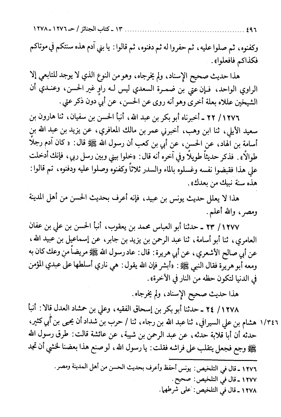 1276 - أَخْبَرْنَاهُ أَبُو بَكْرِ بْنُ عَبْدِ اللَّهِ، أَنْبَأَ الْحَسَنُ بْنُ سُفْيَانَ، ثنا هَارُونُ بْنُ سَعِيدٍ الْأَيْلِيُّ، ثنا ابْنُ وَهْبٍ، أَخْبَرَنِي عُمَرُ بْنُ مَالِكٍ الْمَعَافِرِيُّ، عَنْ يَزِيدَ بْنِ عَبْدِ اللَّهِ بْنِ أُسَامَةَ بْنِ الْهَادِ، عَنِ الْحَسَنِ، عَنْ أُبَيِّ بْنِ كَعْبٍ، أَنَّ رَسُولَ اللَّهِ صَلَّى اللهُ عَلَيْهِ وَسَلَّمَ قَالَ: «كَانَ آدَمُ رَجُلًا طُوَالًا» - فَذَكَرَ حَدِيثًا طَوِيلًا وَفِي آخِرِهِ - أَنَّهُ قَالَ: «§خَلُّوا بَيْنِي وَبَيْنَ رُسُلِ رَبِّي، فَإِنَّكِ أَدْخَلْتِ عَلَيَّ هَذَا، فَقَبَضُوا نَفَسَهُ وَغَسَّلُوهُ بِالْمَاءِ وَالسِّدْرِ ثَلَاثًا، وَكَفَّنُوهُ وَصَلَّوْا عَلَيْهِ وَدَفَنُوهُ، ثُمَّ قَالُوا هَذِهِ سُنَّةُ بَنِيكَ مِنْ بَعْدِكَ» هَذَا لَا يُعَلِّلُ حَدِيثَ يُونُسَ بْنِ عُبَيْدٍ، فَإِنَّهُ أَعْرَفُ بِحَدِيثِ الْحَسَنِ مِنْ أَهْلِ الْمَدِينَةِ وَمِصْرَ، وَاللَّهُ أَعْلَمُ "