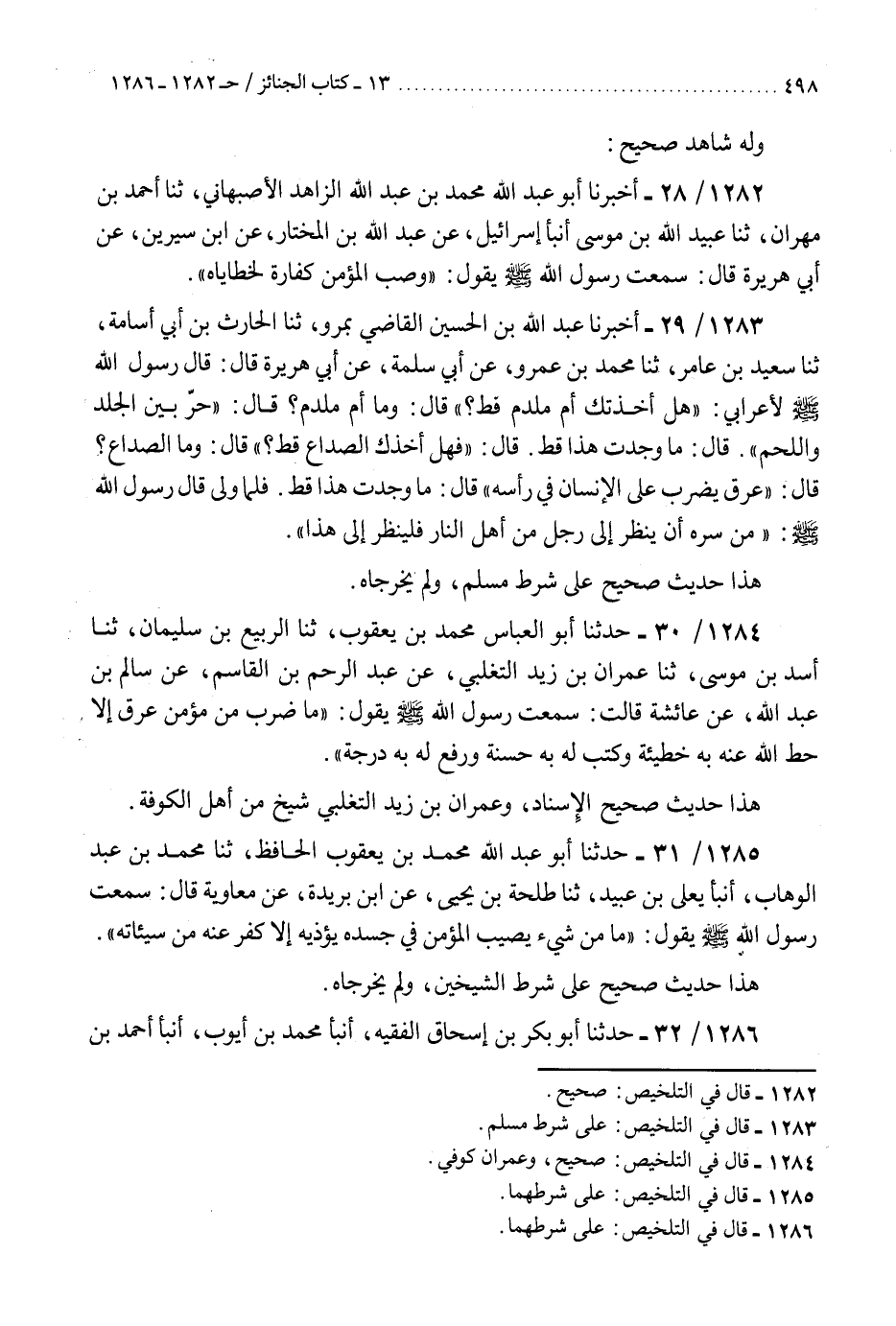 1284 - حَدَّثَنَا أَبُو الْعَبَّاسِ مُحَمَّدُ بْنُ يَعْقُوبَ، ثنا الرَّبِيعُ بْنُ سُلَيْمَانَ، ثنا أَسَدُ بْنُ مُوسَى، ثنا عِمْرَانُ بْنُ زَيْدٍ التَّغْلِبِيُّ، عَنْ عَبْدِ الرَّحْمَنِ بْنِ الْقَاسِمِ، عَنْ سَالِمِ بْنِ عَبْدِ اللَّهِ، عَنْ عَائِشَةَ، قَالَتْ: سَمِعْتُ رَسُولَ اللَّهِ صَلَّى اللهُ عَلَيْهِ وَسَلَّمَ يَقُولُ: §«مَا ضَرَبَ مِنْ مُؤْمِنٍ عِرْقٌ إِلَّا حَطَّ اللَّهُ عَنْهُ بِهِ خَطِيئَةً، وَكَتَبَ لَهُ بِهِ حَسَنَةً، وَرَفَعَ لَهُ بِهِ دَرَجَةً» هَذَا حَدِيثٌ صَحِيحُ الْإِسْنَادِ «وَعِمْرَانُ بْنُ زَيْدٍ التَّغْلِبِيُّ شَيْخٌ مِنْ أَهْلِ الْكُوفَةِ»