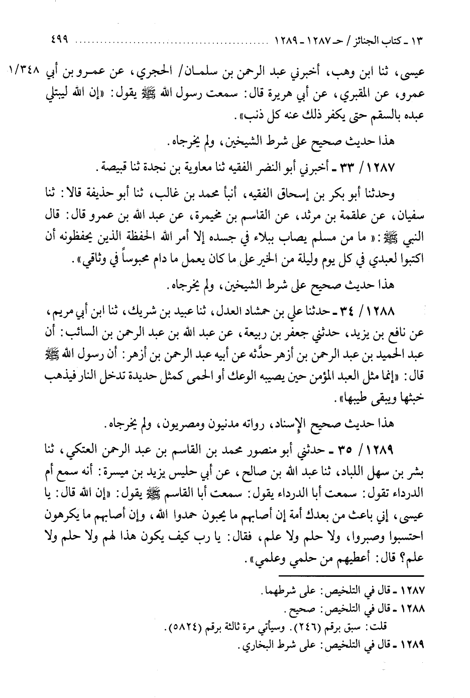 1287 - أَخْبَرَنِي أَبُو النَّضْرِ الْفَقِيهُ، ثنا مُعَاوِيَةُ بْنُ نَجْدَةَ، ثنا قَبِيصَةُ، وَحَدَّثَنَا أَبُو بَكْرِ بْنُ إِسْحَاقَ الْفَقِيهُ، أَنْبَأَ مُحَمَّدُ بْنُ غَالِبٍ، ثنا أَبُو حُذَيْفَةَ، قَالَا: ثنا سُفْيَانُ، عَنْ عَلْقَمَةَ بْنِ مَرْثَدٍ، عَنِ الْقَاسِمِ بْنِ مُخَيْمِرَةَ، عَنْ عَبْدِ اللَّهِ بْنِ عَمْرٍو، قَالَ: قَالَ النَّبِيُّ صَلَّى اللهُ عَلَيْهِ وَسَلَّمَ: §«مَا مِنْ مُسْلِمٍ يُصَابُ بِبَلَاءٍ فِي جَسَدِهِ إِلَّا أَمَرَ اللَّهُ الْحَفَظَةَ الَّذِينَ يَحْفَظُونَهُ أَنِ اكْتُبُوا لِعَبْدِي فِي كُلِّ يَوْمٍ وَلَيْلَةٍ مِنَ الْخَيْرِ عَلَى مَا كَانَ يَعْمَلُ، مَا دَامَ مَحْبُوسًا فِي وَثَاقِي» هَذَا حَدِيثٌ صَحِيحٌ عَلَى شَرْطِ الشَّيْخَيْنِ، وَلَمْ يُخَرِّجَاهُ "