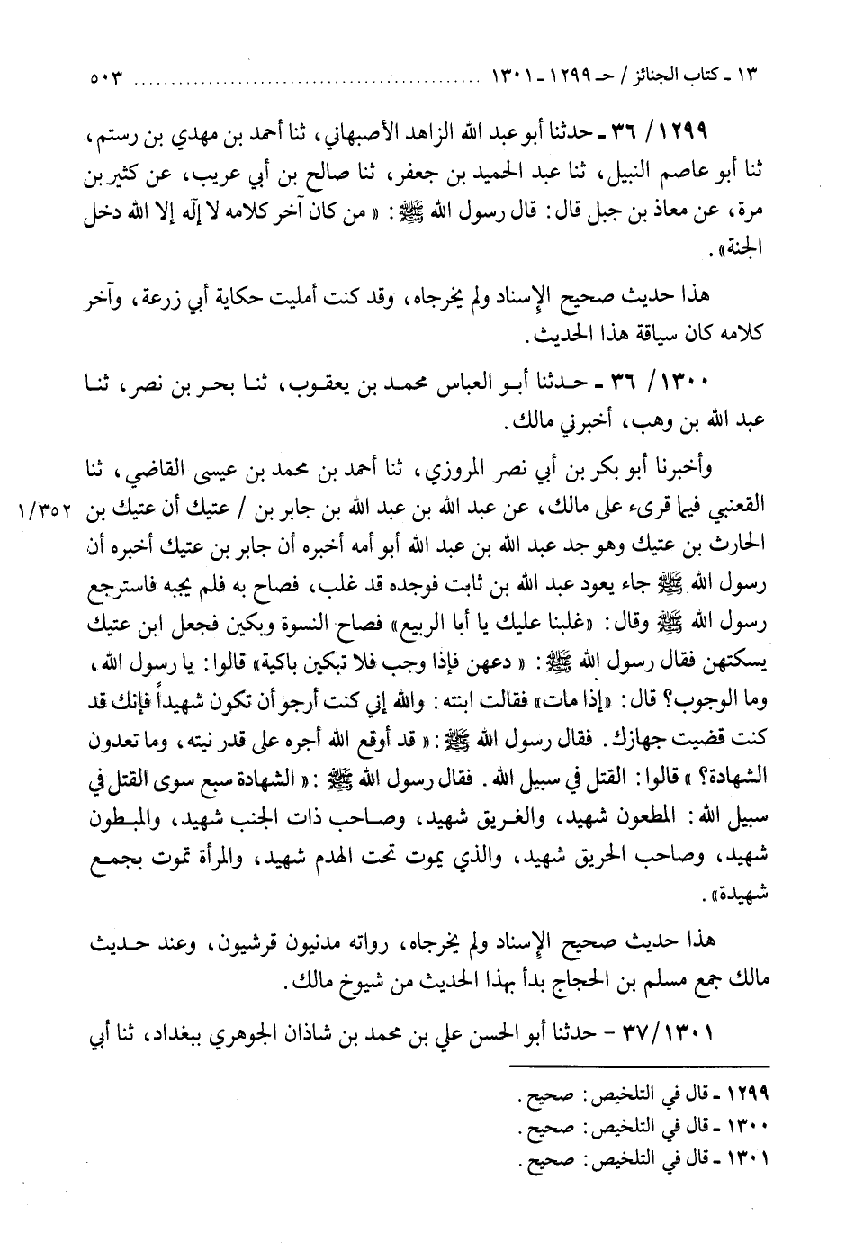 1299 - حَدَّثَنَا أَبُو عَبْدِ اللَّهِ الزَّاهِدُ الْأَصْبَهَانِيُّ، ثنا أَحْمَدُ بْنُ مَهْدِيِّ بْنِ رُسْتُمٍ، ثنا أَبُو عَاصِمٍ النَّبِيلُ، ثنا عَبْدُ الْحَمِيدِ بْنُ جَعْفَرٍ، ثنا صَالِحُ بْنُ أَبِي عَرِيبٍ، عَنْ كَثِيرِ بْنِ مُرَّةَ، عَنْ مُعَاذِ بْنِ جَبَلٍ، قَالَ: قَالَ رَسُولُ اللَّهِ صَلَّى اللهُ عَلَيْهِ وَسَلَّمَ: §«مَنْ كَانَ آخِرُ كَلَامِهِ لَا إِلَهَ إِلَّا اللَّهُ دَخَلَ الْجَنَّةَ» هَذَا حَدِيثٌ صَحِيحُ الْإِسْنَادِ، وَلَمْ يُخَرِّجَاهُ «وَقَدْ كُنْتُ أَمْلَيْتُ حِكَايَةَ أَبِي زُرْعَةَ، وَآخِرَ كَلَامِهِ كَانَ سِيَاقَةُ هَذَا الْحَدِيثِ»