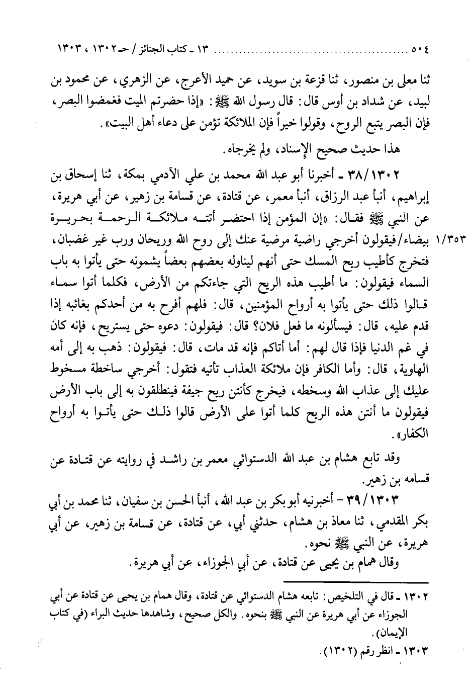 1302 - أَخْبَرَنَا أَبُو عَبْدِ اللَّهِ مُحَمَّدُ بْنُ عَلِيٍّ الْآدَمِيُّ بِمَكَّةَ، ثنا إِسْحَاقُ بْنُ إِبْرَاهِيمَ، أَنْبَأَ عَبْدُ الرَّزَّاقِ، أَنْبَأَ مَعْمَرٌ، عَنْ قَتَادَةَ، عَنْ قَسَامَةَ بْنِ زُهَيْرٍ، عَنْ أَبِي هُرَيْرَةَ، عَنِ النَّبِيِّ صَلَّى اللهُ عَلَيْهِ وَسَلَّمَ، قَالَ: " إِنَّ §الْمُؤْمِنَ إِذَا احْتُضِرَ أَتَتْهُ مَلَائِكَةُ الرَّحْمَةِ بِحَرِيرَةٍ بَيْضَاءَ فَيَقُولُونَ: اخْرُجِي رَاضِيَةً مَرْضِيَّةً عَنْكِ إِلَى رَوْحِ اللَّهِ، وَرَيْحَانٍ، وَرَبٍّ غَيْرِ غَضْبَانَ فَتَخْرُجُ كَأَطْيَبِ رِيحِ الْمِسْكِ حَتَّى أَنَّهُمْ لِيُنَاوِلُهُ بَعْضُهُمْ بَعْضًا يَشُمُّونَهُ حَتَّى يَأْتُوا بِهِ بَابَ السَّمَاءِ فَيَقُولُونَ: مَا أَطْيَبَ هَذِهِ الرِّيحُ الَّتِي جَاءَتْكُمْ مِنَ الْأَرْضِ؟ فَكُلَّمَا أَتَوْا سَمَاءً قَالُوا ذَلِكَ حَتَّى يَأْتُوا بِهِ أَرْوَاحَ الْمُؤْمِنِينَ ". قَالَ: «فَلَهُمْ أَفْرَحُ بِهِ مِنْ أَحَدِكُمْ بِغَائِبِهِ إِذَا قَدِمَ عَلَيْهِ» . قَالَ: «فَيَسْأَلُونَهُ مَا فَعَلَ فُلَانٌ؟» قَالَ: " فَيَقُولُونَ: دَعُوهُ حَتَّى يَسْتَرِيحَ فَإِنَّهُ كَانَ فِي غَمِّ الدُّنْيَا، فَإِذَا قَالَ لَهُمْ: أَمَا أَتَاكُمْ؟ فَإِنَّهُ قَدْ مَاتَ ". قَالَ: «فَيَقُولُونَ ذُهِبَ بِهِ إِلَى أُمِّهِ الْهَاوِيَةِ» . قَالَ: " وَأَمَّا الْكَافِرُ، فَإِنَّ مَلَائِكَةَ الْعَذَابِ تَأْتِيِهِ فَتَقُولُ: اخْرُجِي سَاخِطَةً مَسْخُوطٌ عَلَيْكِ إِلَى عَذَابِ اللَّهِ، وَسَخَطِهِ فَيَخْرُجُ كَأَنْتَنِ رِيحِ جِيفَةٍ فَيَنْطَلِقُونَ بِهِ إِلَى بَابِ الْأَرْضِ فَيَقُولُونَ: مَا أَنْتَنَ هَذِهِ الرِّيحَ كُلَّمَا أَتَوْا عَلَى الْأَرْضِ قَالُوا ذَلِكَ حَتَّى يَأْتُوا بِهِ أَرْوَاحَ الْكُفَّارِ " وَقَدْ تَابَعَ هِشَامُ بْنُ عَبْدِ اللَّهِ الدَّسْتُوَائِيُّ مَعْمَرَ بْنَ رَاشِدٍ فِي رِوَايَتِهِ، عَنْ قَتَادَةَ: عَنْ قَسَامَةَ بْنِ زُهَيْرٍ،