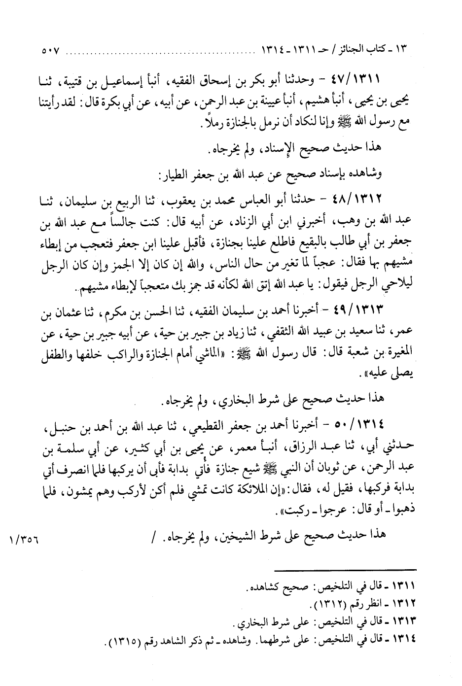 1313 - أَخْبَرَنَا أَحْمَدُ بْنُ سُلَيْمَانَ الْفَقِيهُ، ثنا الْحَسَنُ بْنُ مُكْرَمٍ، ثنا عُثْمَانُ بْنُ عُمَرَ، ثنا سَعِيدُ بْنُ عُبَيْدِ اللَّهِ الثَّقَفِيُّ، ثنا زِيَادُ بْنُ جُبَيْرِ بْنِ حَيَّةَ، عَنْ أَبِيهِ جُبَيْرِ بْنِ حَيَّةَ، عَنِ الْمُغِيرَةِ بْنِ شُعْبَةَ، قَالَ: قَالَ رَسُولُ اللَّهِ صَلَّى اللَّهُ عَلَيْهِ سَلَّمَ: «§الْمَاشِي أَمَامَ الْجِنَازَةِ، وَالرَّاكِبُ خَلْفَهَا، وَالطِّفْلُ يُصَلَّى عَلَيْهِ» هَذَا حَدِيثٌ صَحِيحٌ عَلَى شَرْطِ الْبُخَارِيِّ، وَلَمْ يُخَرِّجَاهُ "