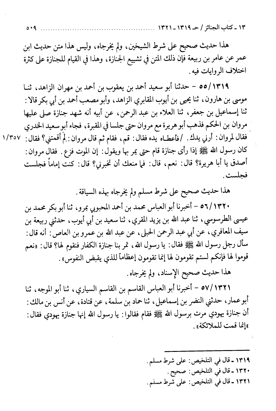1319 - حَدَّثَنَا أَبُو سَعِيدٍ أَحْمَدُ بْنُ يَعْقُوبَ بْنِ أَحْمَدَ بْنِ مِهْرَانَ الزَّاهِدُ، ثنا مُوسَى بْنُ هَارُونَ، ثنا يَحْيَى بْنُ أَيُّوبَ الْمَقَابِرِيُّ الزَّاهِدُ، وَأَبُو مُصْعَبٍ أَحْمَدُ بْنُ أَبِي بَكْرٍ، قَالَا: ثنا إِسْمَاعِيلُ بْنُ جَعْفَرٍ، ثنا الْعَلَاءُ بْنُ عَبْدِ الرَّحْمَنِ، عَنْ أَبِيهِ، أَنَّهُ شَهِدَ جِنَازَةً صَلَّى عَلَيْهَا مَرْوَانُ بْنُ الْحَكَمِ، فَذَهَبَ أَبُو هُرَيْرَةَ مَعَ مَرْوَانَ حَتَّى جَلَسَا فِي الْمَقْبَرَةِ فَجَاءَ أَبُو سَعِيدٍ الْخُدْرِيُّ، فَقَالَ لِمَرْوَانَ: أَرِنِي يَدَكَ فَأَعْطَاهُ يَدَهُ فَقَالَ: قُمْ، فَقَامَ، ثُمَّ قَالَ مَرْوَانُ: لِمَ أَقَمْتَنِي؟ فَقَالَ: كَانَ رَسُولُ اللَّهِ صَلَّى اللهُ عَلَيْهِ وَسَلَّمَ §إِذَا رَأَى جِنَازَةً قَامَ حَتَّى يُمَرَّ بِهَا وَيَقُولُ: «إِنَّ الْمَوْتَ فَزَعٌ» . فَقَالَ مَرْوَانُ: أَصَدَقَ يَا أَبَا هُرَيْرَةَ؟ قَالَ: نَعَمْ. قَالَ: فَمَا مَنَعَكَ أَنْ تُخْبِرَنِي؟ قَالَ: كُنْتَ إِمَامًا فَجَلَسْتَ فَجَلَسْتُ «هَذَا حَدِيثٌ صَحِيحٌ عَلَى شَرْطِ مُسْلِمٍ، وَلَمْ يُخَرِّجَاهُ بِهَذِهِ السِّيَاقَةِ»