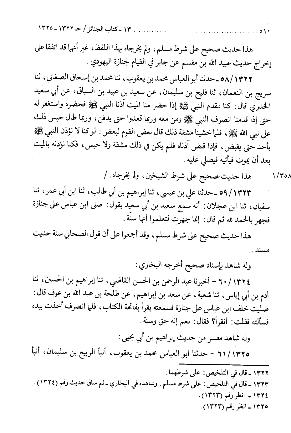 1322 - حَدَّثَنَا أَبُو الْعَبَّاسِ مُحَمَّدُ بْنُ يَعْقُوبَ، ثنا مُحَمَّدُ بْنُ إِسْحَاقَ الصَّغَانِيُّ، ثنا سُرَيْجُ بْنُ النُّعْمَانِ، ثنا فُلَيْحُ بْنُ سُلَيْمَانَ، عَنْ سَعِيدِ بْنِ عُبَيْدِ بْنِ السَّبَّاقِ، عَنْ أَبِي سَعِيدٍ الْخُدْرِيِّ، قَالَ: " كُنَّا مُقَدَّمَ النَّبِيِّ صَلَّى اللهُ عَلَيْهِ وَسَلَّمَ إِذَا حُضِرَ مِنَّا الْمَيِّتُ آذَنَّا النَّبِيَّ صَلَّى اللهُ عَلَيْهِ وَسَلَّمَ فَحَضَرَهُ، وَاسْتَغْفَرَ لَهُ حَتَّى إِذَا قَدِمْنَا انْصَرَفَ النَّبِيُّ صَلَّى اللهُ عَلَيْهِ وَسَلَّمَ وَمَنْ مَعَهُ، وَرُبَّمَا قَعَدُوا حَتَّى يُدْفَنَ، وَرُبَّمَا طَالَ حَبْسُ ذَلِكَ عَلَى نَبِيِّ اللَّهِ صَلَّى اللهُ عَلَيْهِ وَسَلَّمَ، فَلَمَّا خَشِينَا مَشَقَّةَ ذَلِكَ، قَالَ بَعْضُ الْقَوْمِ لِبَعْضٍ: لَوْ كُنَّا لَا نُؤْذِنُ النَّبِيَّ صَلَّى اللهُ عَلَيْهِ وَسَلَّمَ بِأَحَدٍ حَتَّى يُقْبَضَ، فَإِذَا قُبِضَ آذَنَّاهُ، فَلَمْ يَكُنْ فِي ذَلِكَ مَشَقَّةٌ وَلَا حَبْسٌ، §فَكُنَّا نُؤْذِنُهُ بِالْمَيِّتِ بَعْدَ أَنْ يَمُوتَ فَيَأْتِيهِ فَيُصَلِّي عَلَيْهِ «هَذَا حَدِيثٌ صَحِيحٌ عَلَى شَرْطِ الشَّيْخَيْنِ، وَلَمْ يُخَرِّجَاهُ»