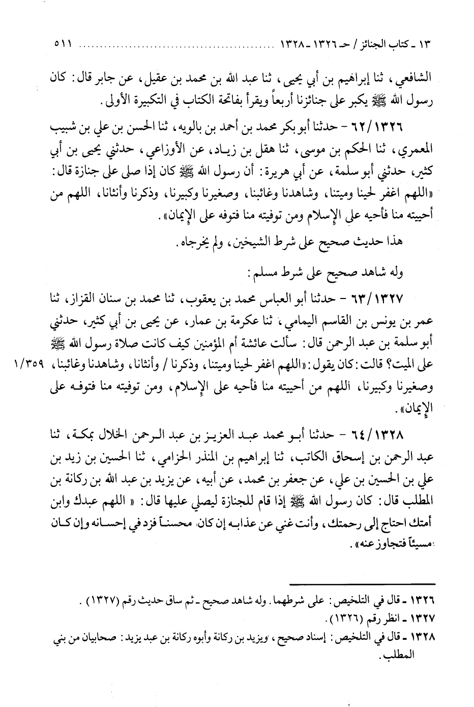 1326 - حَدَّثَنَا أَبُو بَكْرٍ مُحَمَّدُ بْنُ أَحْمَدَ بْنِ بَالَوَيْهِ، ثنا الْحَسَنُ بْنُ عَلِيِّ بْنِ شَبِيبٍ الْمَعْمَرِيُّ، ثنا الْحَكَمُ بْنُ مُوسَى، ثنا هِقْلُ بْنُ زِيَادٍ، عَنِ الْأَوْزَاعِيِّ، حَدَّثَنِي يَحْيَى بْنُ أَبِي كَثِيرٍ، حَدَّثَنِي أَبُو سَلَمَةَ، عَنْ أَبِي هُرَيْرَةَ، أَنَّ رَسُولَ اللَّهِ صَلَّى اللهُ عَلَيْهِ وَسَلَّمَ كَانَ §إِذَا صَلَّى عَلَى جِنَازَةٍ قَالَ: «اللَّهُمَّ اغْفِرْ لِحَيِّنَا وَمَيِّتِنَا، وَشَاهِدِنَا وَغَائِبِنَا، وَصَغِيرِنَا وَكَبِيرِنَا، وَذَكَرِنَا وَأُنْثَانَا، اللَّهُمَّ مَنْ أَحْيَيْتَهُ مِنَّا فَأَحْيِهِ عَلَى الْإِسْلَامِ، وَمَنْ تَوَفَّيْتَهُ مِنَّا فَتَوَفَّهُ عَلَى الْإِيمَانِ» هَذَا حَدِيثٌ صَحِيحٌ عَلَى شَرْطِ الشَّيْخَيْنِ، وَلَمْ يُخَرِّجَاهُ، وَلَهُ شَاهِدٌ صَحِيحٌ عَلَى شَرْطِ مُسْلِمٍ "