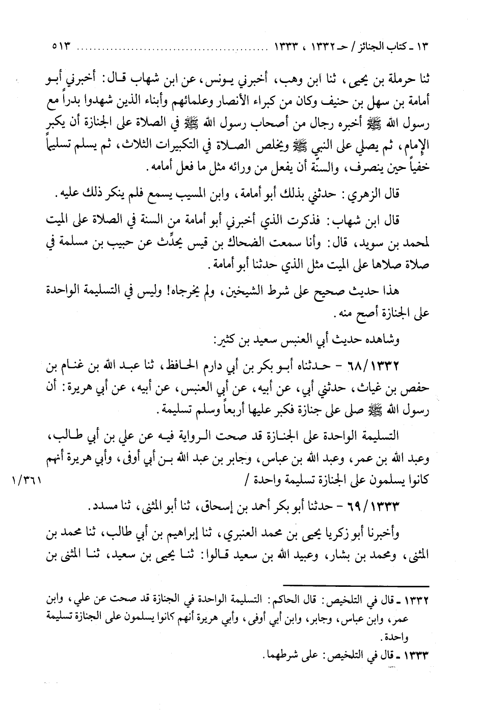 1332 - حَدَّثَنَاهُ أَبُو بَكْرِ بْنُ أَبِي دَارِمٍ الْحَافِظُ، ثنا عَبْدُ اللَّهِ بْنُ غَنَّامِ بْنِ حَفْصِ بْنِ غِيَاثٍ، حَدَّثَنِي أَبِي، عَنْ أَبِيهِ، عَنْ أَبِي الْعَنْبَسِ، عَنْ أَبِيهِ، عَنْ أَبِي هُرَيْرَةَ، «أَنَّ رَسُولَ اللَّهِ صَلَّى اللهُ عَلَيْهِ وَسَلَّمَ §صَلَّى عَلَى جِنَازَةٍ فَكَبَّرَ عَلَيْهَا أَرْبَعًا، وَسَلَّمَ تَسْلِيمَةً التَّسْلِيمَةُ الْوَاحِدَةُ عَلَى الْجِنَازَةِ» قَدْ صَحَّتِ الرِّوَايَةُ فِيهِ، عَنْ عَلِيِّ بْنِ أَبِي طَالِبٍ، وَعَبْدِ اللَّهِ بْنِ عُمَرَ، وَعَبْدِ اللَّهِ بْنِ عَبَّاسٍ، وَجَابِرِ بْنِ عَبْدِ اللَّهِ بْنِ أَبِي أَوْفَى، وَأَبِي هُرَيْرَةَ، أَنَّهُمْ كَانُوا يُسَلِّمُونَ عَلَى الْجِنَازَةِ تَسْلِيمَةً وَاحِدَةً