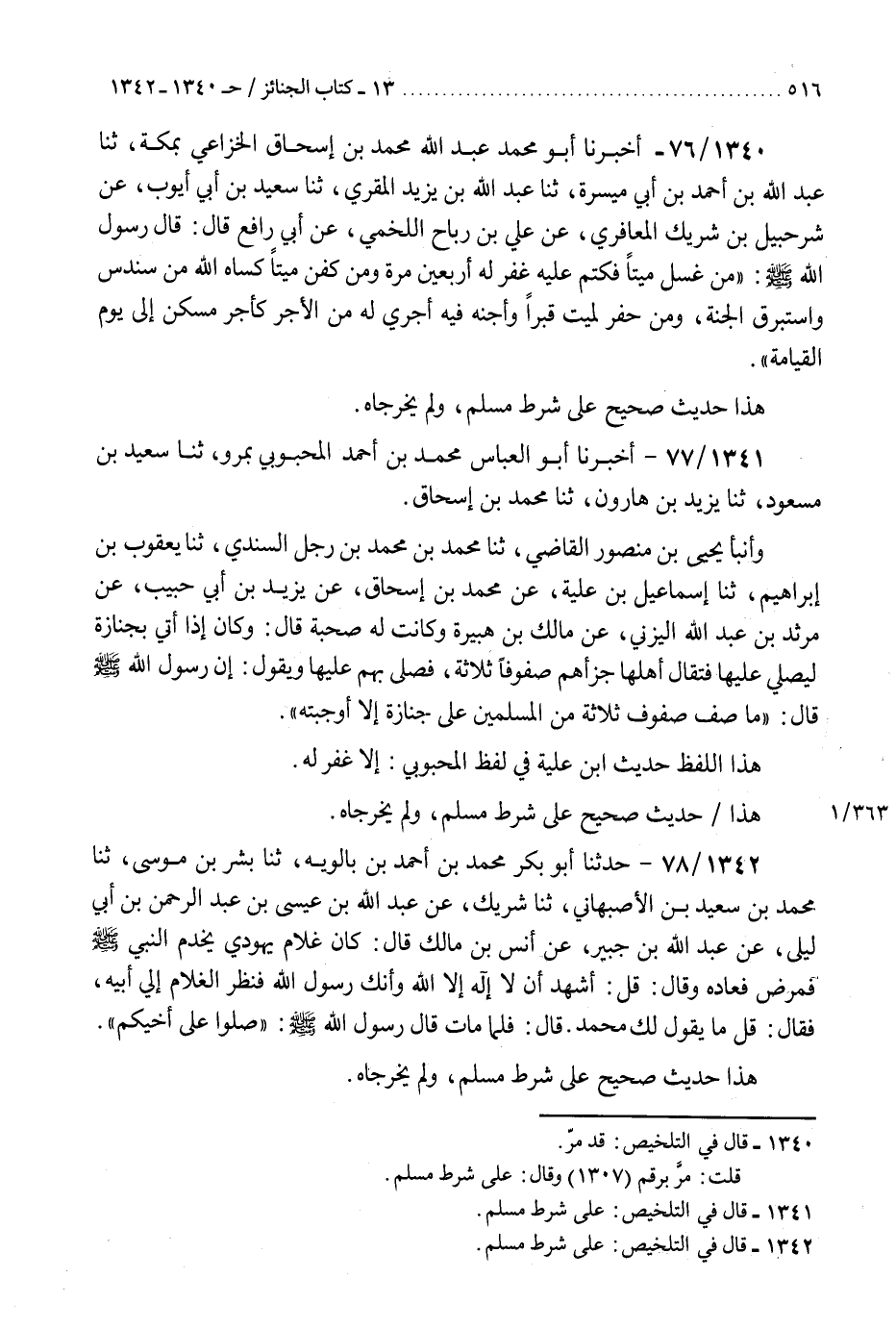 1341 - أَخْبَرَنَا أَبُو الْعَبَّاسِ مُحَمَّدُ بْنُ أَحْمَدَ الْمَحْبُوبِيُّ بِمَرْوَ، ثنا سَعِيدُ بْنُ مَسْعُودٍ، ثنا يَزِيدُ بْنُ هَارُونَ، ثنا مُحَمَّدُ بْنُ إِسْحَاقَ، وَأَنْبَأَ يَحْيَى بْنُ مَنْصُورٍ الْقَاضِي، ثنا مُحَمَّدُ بْنُ مُحَمَّدِ بْنِ رَجَاءٍ السِّنْدِيُّ، ثنا يَعْقُوبُ بْنُ إِبْرَاهِيمَ، ثنا إِسْمَاعِيلُ بْنُ عُلَيَّةَ، عَنْ مُحَمَّدِ بْنِ إِسْحَاقَ، عَنْ يَزِيدَ بْنِ أَبِي حَبِيبٍ، عَنْ مَرْثَدِ بْنِ عَبْدِ اللَّهِ الْيَزَنِيِّ، عَنْ مَالِكِ بْنِ هُبَيْرَةَ، وَكَانَتْ لَهُ صُحْبَةٌ، قَالَ: وَكَانَ إِذَا أُتِيَ بِجِنَازَةٍ لِيُصَلِّيَ عَلَيْهَا، فَتَقَالَّ أَهْلَهَا جَزَّأَهُمْ صُفُوفًا ثَلَاثَةً فَصَلَّى بِهِمْ عَلَيْهَا، وَيَقُولُ إِنَّ رَسُولَ اللَّهِ صَلَّى اللهُ عَلَيْهِ وَسَلَّمَ قَالَ: §«مَا صَفَّ صُفُوفٌ ثَلَاثَةً مِنَ الْمُسْلِمِينَ عَلَى جِنَازَةٍ إِلَّا أَوْجَبَتْهُ» هَذَا اللَّفْظُ حَدِيثُ ابْنُ عُلَيَّةَ فِي لَفْظِ الْمَحْبُوبِيِّ، «إِلَّا غُفِرَ لَهُ» هَذَا حَدِيثٌ صَحِيحٌ عَلَى شَرْطِ مُسْلِمٍ، وَلَمْ يُخَرِّجَاهُ "