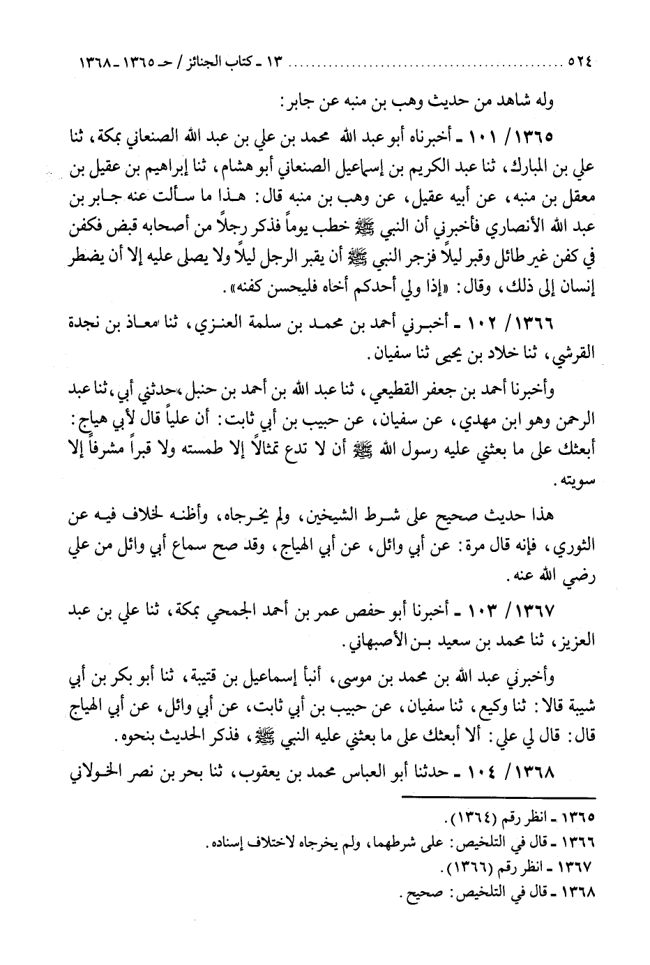 1366 - أَخْبَرَنِي أَحْمَدُ بْنُ مُحَمَّدِ بْنِ سَلَمَةَ الْعَنَزِيُّ، ثنا مُعَاذُ بْنُ نَجْدَةَ الْقُرَشِيُّ، ثنا خَلَّادُ بْنُ يَحْيَى، ثنا سُفْيَانُ، وَأَخْبَرَنَا أَحْمَدُ بْنُ جَعْفَرٍ الْقَطِيعِيُّ، ثنا عَبْدُ اللَّهِ بْنُ أَحْمَدَ بْنِ حَنْبَلٍ، حَدَّثَنِي أَبِي، ثنا عَبْدُ الرَّحْمَنِ وَهُوَ ابْنُ مَهْدِيٍّ، عَنْ سُفْيَانَ، عَنْ حَبِيبِ بْنِ أَبِي ثَابِتٍ، أَنَّ عَلِيًّا قَالَ لِأَبِي هَيَّاجٍ: «أَبْعَثُكَ عَلَى مَا بَعَثَنِي عَلَيْهِ رَسُولُ اللَّهِ صَلَّى اللهُ عَلَيْهِ وَسَلَّمَ، §أَنْ لَا تَدَعْ تِمْثَالًا إِلَّا طَمَسْتَهُ، وَلَا قَبْرًا مُشْرِفًا إِلَّا سَوَّيْتَهُ» هَذَا حَدِيثٌ صَحِيحٌ عَلَى شَرْطِ الشَّيْخَيْنِ، وَلَمْ يُخَرِّجَاهُ. وَأَظُنُّهُ لِخِلَافٍ فِيهِ، عَنِ الثَّوْرِيِّ فَإِنَّهُ قَالَ مَرَّةً: عَنْ أَبِي وَائِلٍ، عَنْ أَبِي الْهَيَّاجِ، وَقَدْ صَحَّ سَمَاعُ أَبِي وَائِلٍ مِنْ عَلِيٍّ رَضِيَ اللَّهُ عَنْهُ "