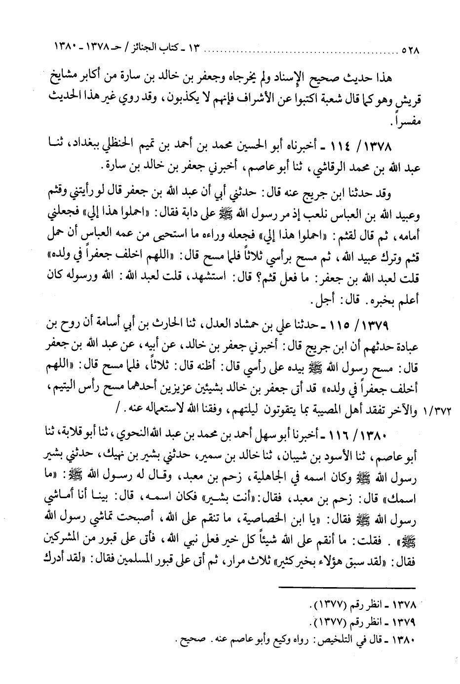 1379 - حَدَّثَنَا عَلِيُّ بْنُ حَمْشَاذَ الْعَدْلُ، ثنا الْحَارِثُ بْنُ أَبِي أُسَامَةَ، أَنَّ رَوْحَ بْنَ عُبَادَةَ، حَدَّثَهُمْ أَنَّ ابْنَ جُرَيْجٍ، قَالَ: أَخْبَرَنِي جَعْفَرُ بْنُ خَالِدٍ، عَنْ أَبِيهِ، عَنْ عَبْدِ اللَّهِ بْنِ جَعْفَرٍ، قَالَ: مَسَحَ رَسُولُ اللَّهِ صَلَّى اللهُ عَلَيْهِ وَسَلَّمَ بِيَدِهِ عَلَى رَأْسِي قَالَ: - أَظُنُّهُ قَالَ ثَلَاثًا - فَلَمَّا مَسَحَ قَالَ: §«اللَّهُمَّ اخْلُفْ جَعْفَرًا فِي وَلَدِهِ» قَدْ أَتَى جَعْفَرُ بْنُ خَالِدٍ بِشَيْئَيْنِ عَزِيزَيْنِ: أَحَدُهُمَا مَسْحُ رَأْسِ الْيَتِيمِ، وَالْآخَرُ تَفَقُّدُ أَهْلِ الْمُصِيبَةِ بِمَا يَتَقَوَّتُونَ لَيْلَتَهُمْ «وَفَّقَنَا اللَّهُ لِاسْتِعْمَالِهِ عَنْهُ»