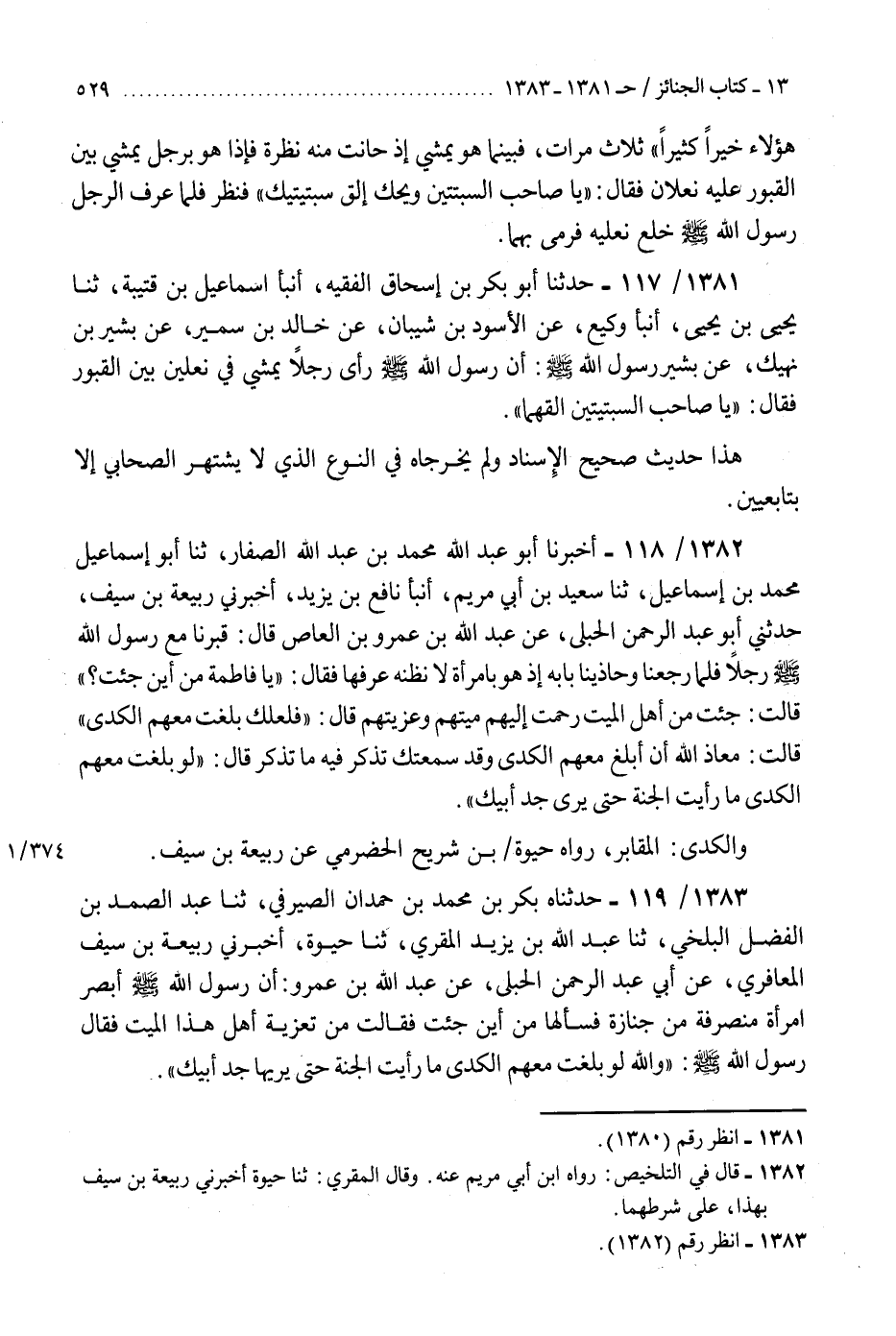 1382 - أَخْبَرَنَا أَبُو عَبْدِ اللَّهِ مُحَمَّدُ بْنُ عَبْدِ اللَّهِ الصَّفَّارُ، ثنا أَبُو إِسْمَاعِيلَ مُحَمَّدُ بْنُ إِسْمَاعِيلَ، ثنا سَعِيدُ بْنُ أَبِي مَرْيَمَ، أَنْبَأَ نَافِعُ بْنُ يَزِيدَ، أَخْبَرَنِي رَبِيعَةُ بْنُ سَيْفٍ، حَدَّثَنِي أَبُو عَبْدِ الرَّحْمَنِ الْحُبُلِيُّ، عَنْ عَبْدِ اللَّهِ بْنِ عَمْرِو بْنِ الْعَاصِ، قَالَ: قَبَرْنَا مَعَ رَسُولِ اللَّهِ صَلَّى اللهُ عَلَيْهِ وَسَلَّمَ رَجُلًا، فَلَمَّا رَجَعْنَا وَحَاذَيْنَا بَابَهُ إِذْ هُوَ بِامْرَأَةٍ لَا نَظُنُّهُ عَرَفَهَا، فَقَالَ: «يَا فَاطِمَةُ مِنْ أَيْنَ جِئْتِ؟» قَالَتْ: جِئْتُ مِنْ أَهْلِ الْمَيِّتِ رَحِمْتُ إِلَيْهِمْ مَيِّتَهُمْ وَعَزَّيْتُهُمْ. قَالَ: «فَلَعَلَّكِ بَلَغْتَ مَعَهُمُ الْكُدَى؟» قَالَتْ: مَعَاذَ اللَّهِ أَنْ أَبْلَغَ مَعَهُمُ الْكُدَى، وَقَدْ سَمِعْتُكَ تَذْكُرُ فِيهِ مَا تَذْكُرُ، قَالَ: §«لَوْ بَلَغْتِ مَعَهُمُ الْكُدَى مَا رَأَيْتِ الْجَنَّةَ حَتَّى يَرَى جَدُّ أَبِيكِ» وَالْكُدَى: الْمَقَابِرُ " رَوَاهُ حَيْوَةُ بْنُ شُرَيْحٍ الْحَضْرَمِيُّ، عَنْ رَبِيعَةَ بْنِ سَيْفٍ