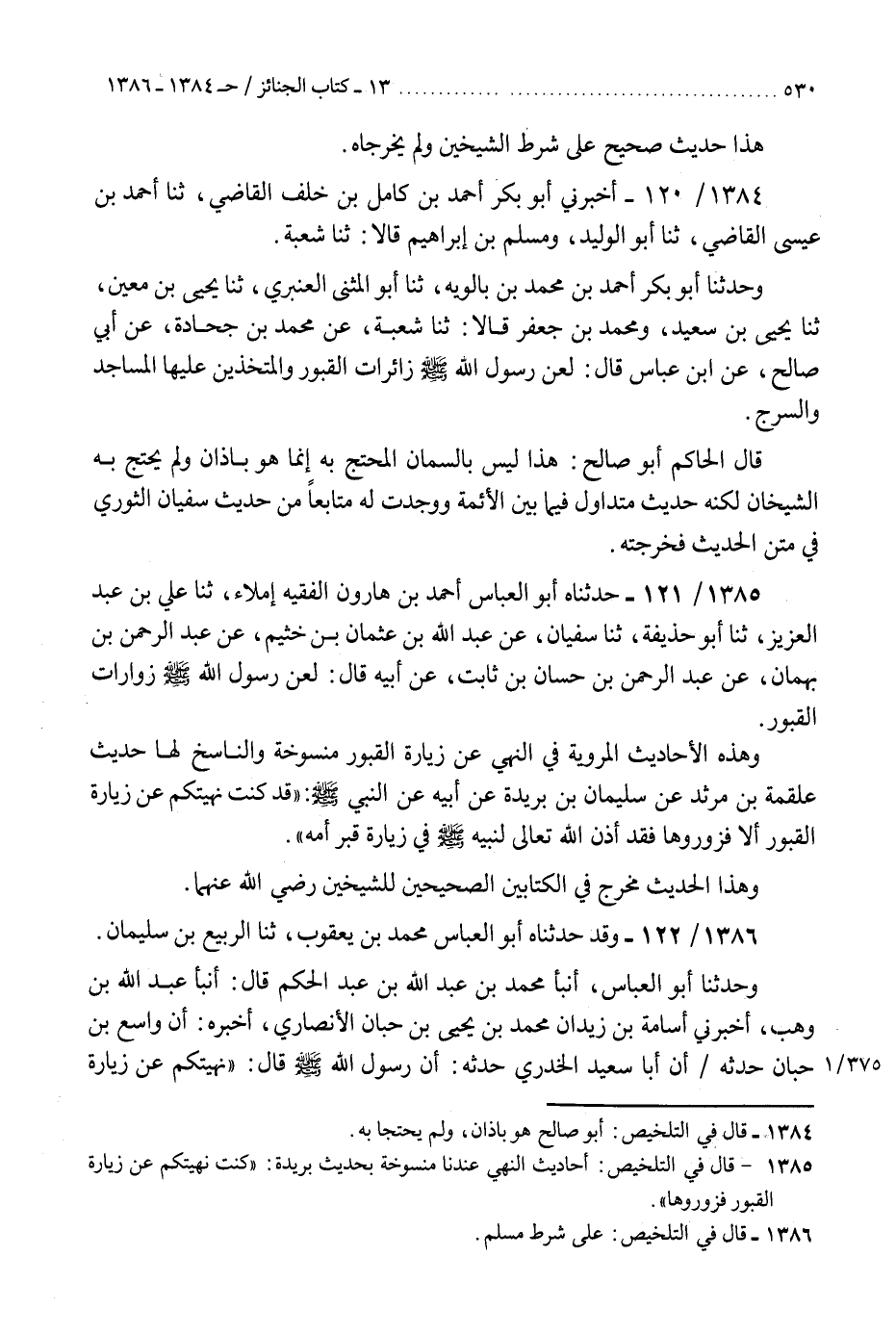 1384 - أَخْبَرَنِي أَبُو بَكْرٍ أَحْمَدُ بْنُ كَامِلِ بْنِ خَلَفٍ الْقَاضِي، ثنا أَحْمَدُ بْنُ عِيسَى الْقَاضِي، ثنا أَبُو الْوَلِيدِ، وَمُسْلِمُ بْنُ إِبْرَاهِيمَ، قَالَا: ثنا شُعْبَةُ، وَحَدَّثَنَا أَبُو بَكْرٍ أَحْمَدُ بْنُ مُحَمَّدِ بْنِ بَالَوَيْهِ، ثنا أَبُو الْمُثَنَّى الْعَنْبَرِيُّ، ثنا يَحْيَى بْنُ مَعِينٍ، ثنا يَحْيَى بْنُ سَعِيدٍ، وَمُحَمَّدُ بْنُ جَعْفَرٍ، قَالَا: ثنا شُعْبَةُ، عَنْ مُحَمَّدِ بْنِ جُحَادَةَ، عَنْ أَبِي صَالِحٍ، عَنِ ابْنِ عَبَّاسٍ، قَالَ: «§لَعَنَ رَسُولُ اللَّهِ صَلَّى اللهُ عَلَيْهِ وَسَلَّمَ زَائِرَاتِ الْقُبُورِ، وَالْمُتَّخِذِينَ عَلَيْهَا الْمَسَاجِدَ وَالسُّرُجَ» قَالَ الْحَاكِمُ: «أَبُو صَالِحٍ هَذَا لَيْسَ بِالسَّمَّانِ الْمُحْتَجِّ بِهِ، إِنَّمَا هُوَ بَاذَانُ، وَلَمْ يَحْتَجَّ بِهِ الشَّيْخَانِ لَكِنَّهُ حَدِيثٌ مُتَدَاوَلٌ فِيمَا بَيْنَ الْأَئِمَّةِ، وَوَجَدْتُ لَهُ مُتَابِعًا مِنْ حَدِيثِ سُفْيَانَ الثَّوْرِيِّ فِي مَتْنِ الْحَدِيثِ فَخَرَّجْتُهُ»