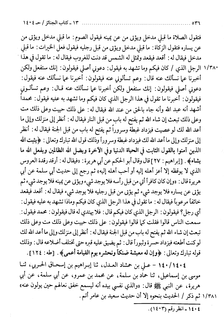 1404 - عَلِيُّ بْنُ حَمْشَاذَ الْعَدْلُ، ثنا إِبْرَاهِيمُ بْنُ إِسْحَاقَ الْحَرْبِيُّ، ثنا مُوسَى بْنُ إِسْمَاعِيلَ، ثنا حَمَّادُ بْنُ سَلَمَةَ، عَنْ مُحَمَّدِ بْنِ عَمْرٍو، عَنْ أَبِي سَلَمَةَ، عَنْ أَبِي هُرَيْرَةَ، عَنِ النَّبِيِّ صَلَّى اللهُ عَلَيْهِ وَسَلَّمَ قَالَ: «وَالَّذِي نَفْسِي بِيَدِهِ، §إِنَّهُ لَيَسْمَعُ خَفْقَ نِعَالِهِمْ حِينَ يُوَلُّونَ عَنْهُ» ثُمَّ ذَكَرَ الْحَدِيثَ بِنَحْوِهِ إِلَّا أَنَّ حَدِيثَ سَعِيدِ بْنِ عَامِرٍ أَتَمُّ «هَذَا حَدِيثٌ صَحِيحٌ عَلَى شَرْطِ مُسْلِمٍ، وَلَمْ يُخَرِّجَاهُ»