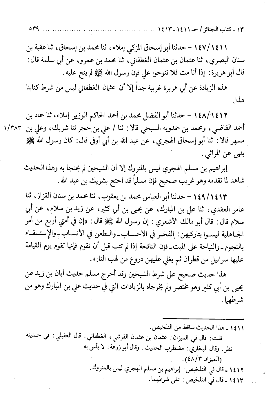 1412 - حَدَّثَنَا أَبُو الْفَضْلِ مُحَمَّدُ بْنُ أَحْمَدَ الْحَاكِمُ الْوَزِيرُ إِمْلَاءً، ثنا حَمَّادُ بْنُ أَحْمَدَ الْقَاضِي، وَمُحَمَّدُ بْنُ حَمْدَوَيْهِ السِّنْجِيُّ، قَالَا: ثنا عَلِيُّ بْنُ حُجْرٍ، ثنا شَرِيكٌ، وَعَلِيُّ بْنُ مُسْهِرٍ، قَالَا: ثنا أَبُو إِسْحَاقَ الْهَجَرِيُّ، عَنْ عَبْدِ اللَّهِ بْنِ أَبِي أَوْفَى، قَالَ: «كَانَ رَسُولُ اللَّهِ صَلَّى اللهُ عَلَيْهِ وَسَلَّمَ §يَنْهَى عَنِ الْمَرَاثِي» إِبْرَاهِيمَ بْنِ مُسْلِمٍ الْهَجَرِيِّ لَيْسَ بِالْمَتْرُوكِ، إِلَّا أَنَّ الشَّيْخَيْنِ لَمْ يَحْتَجَّا بِهِ، وَهَذَا الْحَدِيثُ شَاهِدٌ لِمَا تَقَدَّمَهُ وَهُوَ غَرِيبٌ صَحِيحٌ، فَإِنَّ مُسْلِمًا قَدِ احْتَجَّ بِشَرِيكِ بْنِ عَبْدِ اللَّهِ "
