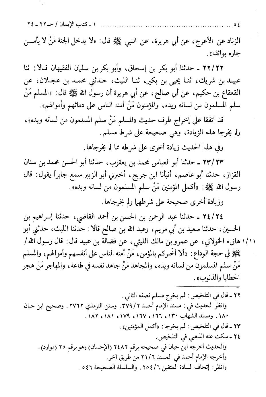 22 - حَدَّثَنَا أَبُو بَكْرِ بْنُ إِسْحَاقَ، وَأَبُو بَكْرِ بْنُ سَلْمَانَ الْفَقِيهَانِ قَالَا: ثنا عُبَيْدُ بْنُ شَرِيكٍ، ثنا يَحْيَى بْنُ بُكَيْرٍ، ثنا اللَّيْثُ، حَدَّثَنِي مُحَمَّدُ بْنُ عَجْلَانَ، عَنِ الْقَعْقَاعِ بْنِ حَكِيمٍ، عَنْ أَبِي صَالِحٍ، عَنْ أَبِي هُرَيْرَةَ، أَنَّ رَسُولَ اللَّهِ صَلَّى اللهُ عَلَيْهِ وَسَلَّمَ، قَالَ: «§الْمُسْلِمُ مَنْ سَلِمَ الْمُسْلِمُونَ مِنْ لِسَانِهِ وَيَدِهِ، وَالْمُؤْمِنُ مَنْ أَمِنَهُ النَّاسُ عَلَى دِمَائِهِمْ وَأَمْوَالِهِمْ» قَدِ اتَّفَقَا عَلَى إِخْرَاجِ طَرَفِ حَدِيثِ «الْمُسْلِمُ مَنْ سَلِمَ الْمُسْلِمُونَ مِنْ لِسَانِهِ وَيَدِهِ» وَلَمْ يُخَرِّجَا هَذِهِ الزِّيَادَةَ وَهِيَ صَحِيحَةٌ عَلَى شَرْطِ مُسْلِمٍ، وَفِي هَذَا الْحَدِيثِ زِيَادَةٌ أُخْرَى عَلَى شَرْطِهِ مِمَّا لَمْ يُخَرِّجَاهَا "K22 - لم يخرج مسلم نصفه الثاني