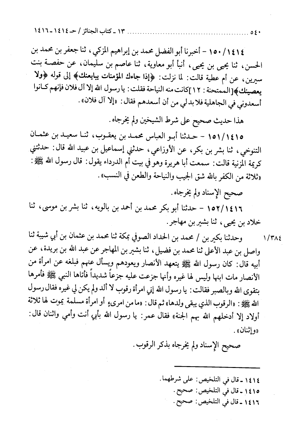 1414 - أَخْبَرَنَا أَبُو الْفَضْلِ مُحَمَّدُ بْنُ إِبْرَاهِيمَ الْمُزَكِّي، ثنا جَعْفَرُ بْنُ مُحَمَّدِ بْنِ الْحَسَنِ، ثنا يَحْيَى بْنُ يَحْيَى، أَنْبَأَ أَبُو مُعَاوِيَةَ، ثنا عَاصِمُ بْنُ سُلَيْمَانَ، عَنْ حَفْصَةَ بِنْتِ سِيرِينَ، عَنْ أُمِّ عَطِيَّةَ، قَالَتْ: " §لَمَّا نَزَلَتْ: {إِذَا جَاءَكَ الْمُؤْمِنَاتُ يُبَايِعْنَكَ} [الممتحنة: 12] إِلَى قَوْلِهِ: {وَلَا يَعْصِينَكَ} [الممتحنة: 12] كَانَتْ مِنْهُ النِّيَاحَةُ، فَقُلْتُ: يَا رَسُولَ اللَّهِ إِلَّا آلَ فُلَانٍ، فَإِنَّهُمْ كَانُوا أَسْعَدُونِي فِي الْجَاهِلِيَّةِ فَلَا بُدَّ لِي مِنْ أَنْ أُسْعِدَهُمْ، فَقَالَ: «إِلَّا آلَ فُلَانٍ» هَذَا حَدِيثٌ صَحِيحٌ عَلَى شَرْطِ الشَّيْخَيْنِ، وَلَمْ يُخَرِّجَاهُ "