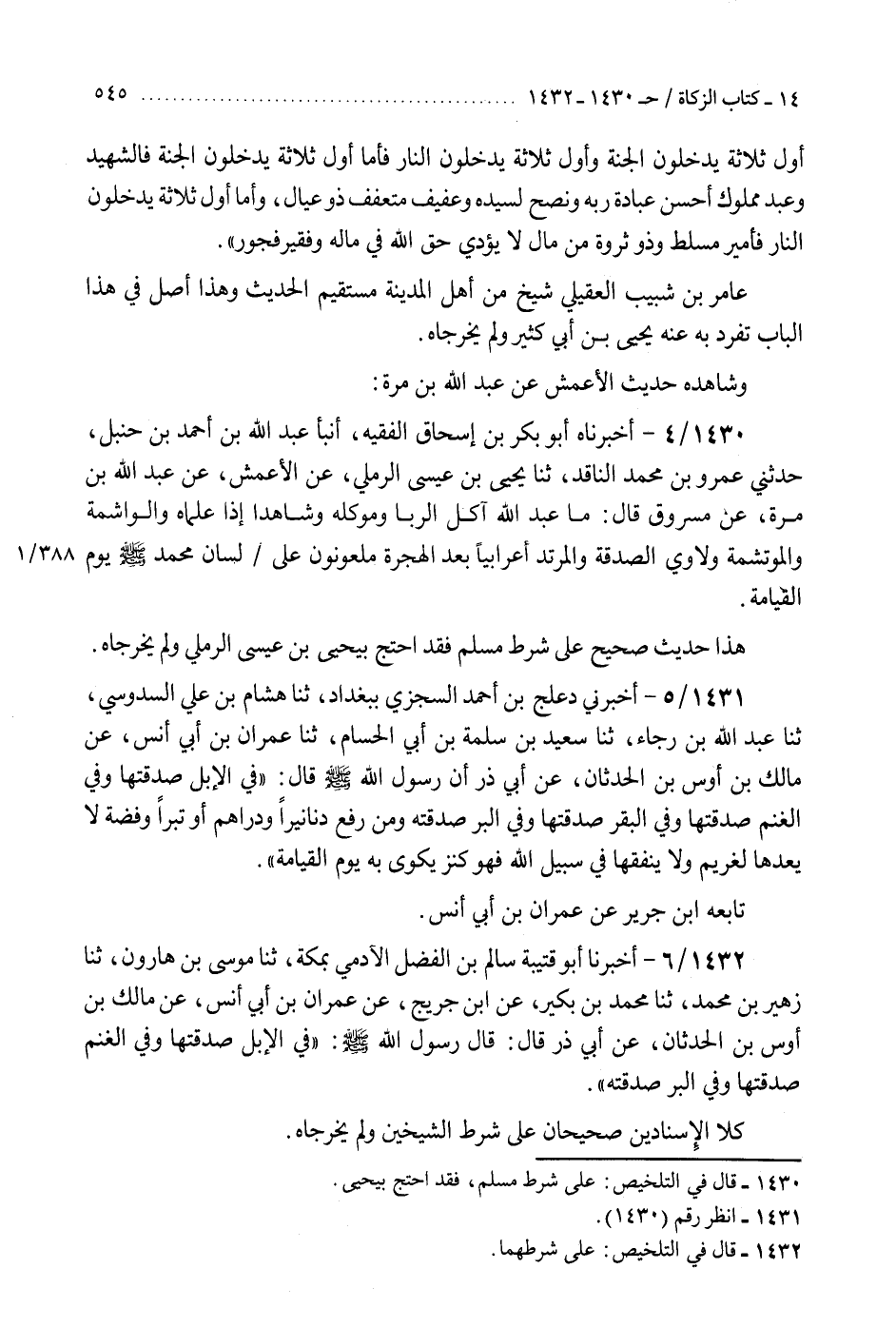 1432 - أَخْبَرَنَا أَبُو قُتَيْبَةَ سَالِمُ بْنُ الْفَضْلِ الْآدَمِيُّ بِمَكَّةَ، ثنا مُوسَى بْنُ هَارُونَ، ثنا زُهَيْرُ بْنُ مُحَمَّدٍ، ثنا مُحَمَّدُ بْنُ بُكَيْرٍ، عَنِ ابْنِ جُرَيْجٍ، عَنْ عِمْرَانَ بْنِ أَبِي أَنَسٍ، عَنْ مَالِكِ بْنِ أَوْسِ بْنِ الْحَدَثَانِ، عَنْ أَبِي ذَرٍّ، قَالَ: قَالَ رَسُولُ اللَّهِ صَلَّى اللهُ عَلَيْهِ وَسَلَّمَ: «§فِي الْإِبِلِ صَدَقَتُهَا، وَفِي الْغَنَمِ صَدَقَتُهَا، وَفِي الْبُرِّ صَدَقَتُهُ» كِلَا الْإِسْنَادَيْنِ صَحِيحَانِ عَلَى شَرْطِ الشَّيْخَيْنِ، وَلَمْ يُخَرِّجَاهُ "