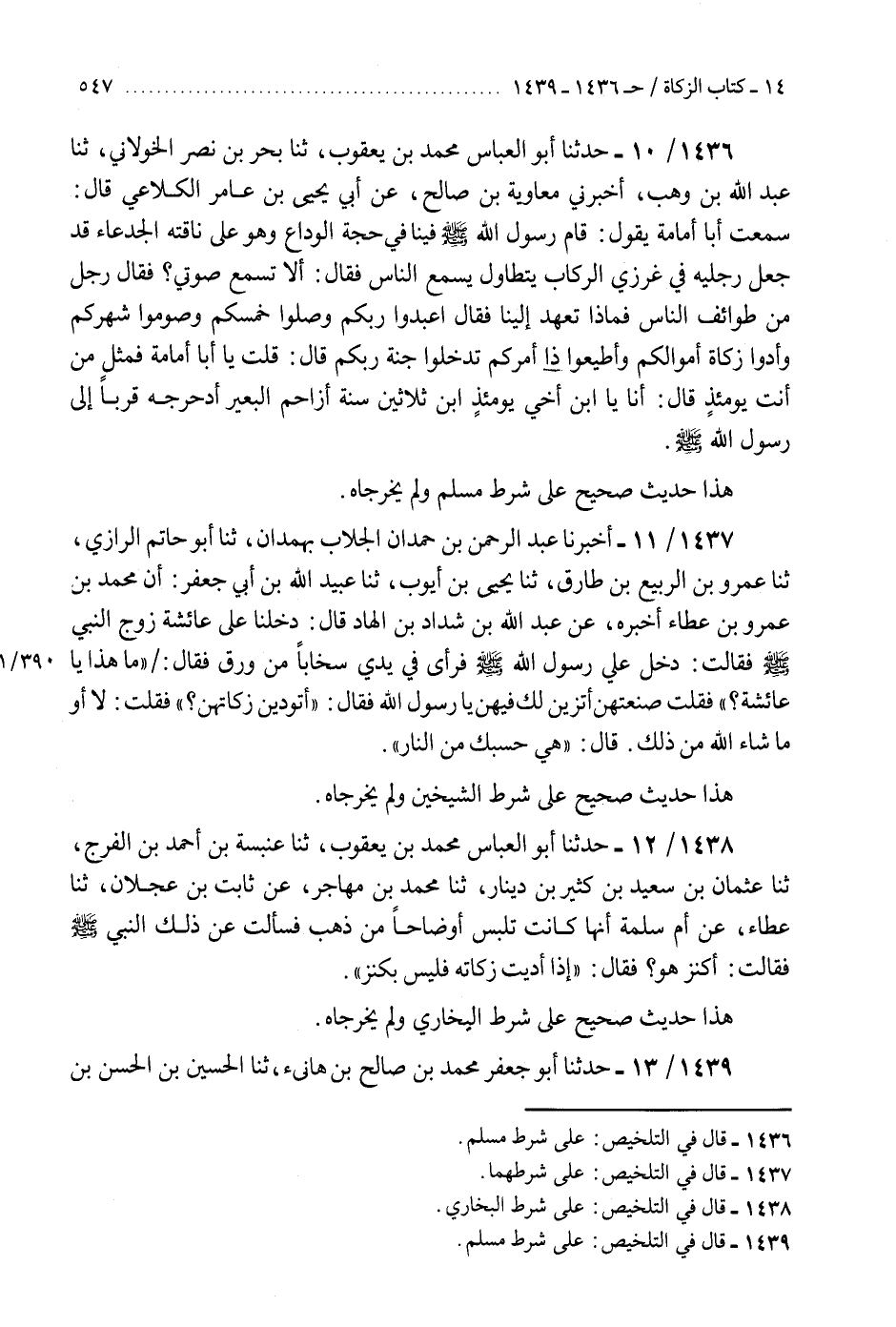 1439 - حَدَّثَنَا أَبُو جَعْفَرٍ مُحَمَّدُ بْنُ صَالِحِ بْنِ هَانِئٍ، ثنا الْحُسَيْنُ بْنُ الْحَسَنِ بْنِ الْمُهَاجِرِ، ثنا هَارُونُ بْنُ سَعِيدٍ الْأَيْلِيُّ، ثنا عَبْدُ اللَّهِ بْنُ وَهْبٍ، أَخْبَرَنِي ابْنُ جُرَيْجٍ، عَنْ أَبِي الزُّبَيْرِ، عَنْ جَابِرِ بْنِ عَبْدِ اللَّهِ، عَنِ النَّبِيِّ صَلَّى اللهُ عَلَيْهِ وَسَلَّمَ، قَالَ: §«إِذَا أَدَّيْتَ زَكَاةَ مَالِكَ فَقَدْ أَذْهَبْتَ عَنْكَ شَرَّهُ» هَذَا حَدِيثٌ صَحِيحٌ عَلَى شَرْطِ مُسْلِمٍ، وَلَمْ يُخَرِّجَاهُ، وَشَاهِدُهُ صَحِيحٌ مِنْ حَدِيثِ الْمِصْرِيِّينَ "