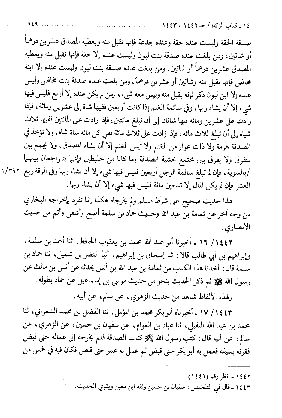 1443 - أَخْبَرْنَاهُ أَبُو بَكْرٍ مُحَمَّدُ بْنُ الْمُؤَمَّلِ، ثنا الْفَضْلُ بْنُ مُحَمَّدٍ الشَّعْرَانِيُّ، ثنا مُحَمَّدُ بْنُ عَبْدِ اللَّهِ النُّفَيْلِيُّ، ثنا عَبَّادُ بْنُ الْعَوَّامِ، عَنْ سُفْيَانَ بْنِ حُسَيْنٍ، عَنِ الزُّهْرِيِّ، عَنْ سَالِمٍ، عَنْ أَبِيهِ، قَالَ: كَتَبَ رَسُولُ اللَّهِ صَلَّى اللهُ عَلَيْهِ وَسَلَّمَ كِتَابَ الصَّدَقَةِ فَلَمْ يُخَرِّجْهُ إِلَى عُمَّالِهِ حَتَّى قُبِضَ، فَقَرَنَهُ بِسَيْفِهِ فَعَمِلَ بِهِ أَبُو بَكْرٍ حَتَّى قُبِضَ، ثُمَّ عَمِلَ بِهِ عُمَرُ حَتَّى قُبِضَ، فَكَانَ فِيهِ: «§فِي خَمْسٍ مِنَ الْإِبِلِ شَاةٌ وَفِي عَشَرَةٍ شَاتَانِ، وَفِي خَمْسَ عَشْرَةَ ثَلَاثُ شِيَاهٍ، وَفِي عِشْرِينَ أَرْبَعُ شِيَاهٍ، وَفِي خَمْسٍ وَعِشْرِينَ بِنْتُ مَخَاضٍ إِلَى خَمْسٍ وَثَلَاثِينَ، فَإِذَا زَادَتْ وَاحِدَةٌ فَفِيهَا بِنْتُ لَبُونٍ إِلَى خَمْسٍ وَأَرْبَعِينَ، فَإِنْ زَادَتْ وَاحِدَةً فَفِيهَا حِقَّةٌ إِلَى سِتِّينَ، فَإِنْ زَادَتْ وَاحِدَةٌ فَفِيهَا جَذَعَةٌ إِلَى خَمْسَةٍ وَسَبْعِينَ، فَإِذَا زَادَتْ وَاحِدَةٌ فَفِيهَا بِنْتَا لَبُونٍ إِلَى تِسْعِينَ، فَإِذَا زَادَتْ وَاحِدَةٌ فَفِيهَا حِقَّتَانِ إِلَى عِشْرِينَ وَمِائَةٍ، فَإِنْ كَانَتِ الْإِبِلُ أَكْثَرُ مِنْ ذَلِكَ فَفِي كُلِّ خَمْسِينَ حِقَّةٌ، وَفِي كُلِّ أَرْبَعِينَ بِنْتُ لَبُونٍ وَفِي الْغَنَمِ فِي كُلِّ أَرْبَعِينَ شَاةً شَاةٌ إِلَى عِشْرِينَ وَمِائَةٍ، فَإِذَا زَادَتْ وَاحِدَةٌ فَشَاتَانِ إِلَى مِائَتَيْنِ، فَإِذَا زَادَتْ وَاحِدَةٌ عَلَى الْمِائَتَيْنِ فَفِيهَا ثَلَاثُ شِيَاهٍ إِلَى ثَلَاثِ مِائَةٍ، فَإِنْ كَانَتِ الْغَنَمُ أَكْثَرُ مِنْ ذَلِكَ فَفِي كُلِّ مِائَةِ شَاةٍ شَاةٌ وَلَيْسَ فِيهَا شَيْءٌ حَتَّى يَبْلُغَ الْمِائَةُ، وَلَا يُفَرَّقُ بَيْنَ مُجْتَمِعٍ، وَلَا يُجْمَعُ بَيْنَ مُتَفَرِّقٍ مَخَافَةَ الصَّدَقَةِ، وَمَا كَانَ مِنْ خَلِيطَيْنِ فَإِنَّهُمَا يَتَرَاجَعَانِ بِالسَّوِيَّةِ، وَلَا يُؤْخَذُ فِي الصَّدَقَةِ هَرِمَةٌ وَلَا ذَاتُ عَيْبٍ» قَالَ الزُّهْرِيُّ: «إِذَا جَاءَ الْمُصَدِّقُ قُسِمَتِ الشَّاءُ أَثْلَاثًا ثُلُثًا شِرَارًا، وَثُلُثًا خِيَارًا، وَثُلُثًا وَسَطًا، فَيَأْخُذُ الْمُصَدِّقُ مِنَ الْوَسَطِ» وَلَمْ يَذْكُرِ الزُّهْرِيُّ الْبَقَرَ، هَذَا حَدِيثٌ كَبِيرٌ فِي هَذَا الْبَابِ يَشْهَدُ بِكَثْرَةِ الْأَحْكَامِ الَّتِي فِي حَدِيثِ ثُمَامَةَ، عَنْ أَنَسٍ إِلَّا أَنَّ الشَّيْخَيْنِ لَمْ يُخَرِّجَا لِسُفْيَانَ بْنِ حُسَيْنٍ الْوَاسِطِيِّ فِي الْكِتَابَيْنِ، وَسُفْيَانُ بْنُ حُسَيْنٍ أَحَدُ أَئِمَّةِ الْحَدِيثِ وَثَّقَهُ يَحْيَى بْنُ مَعِينٍ، وَدَخَلَ خُرَاسَانَ مَعَ يَزِيدَ بْنِ الْمُهَلَّبِ، وَدَخَلَ مِنْهُ نَيْسَابُورَ سَمِعَ مِنْهُ جَمَاعَةٌ مِنْ مَشَايِخِنَا الْقُهُنْدُزِيُّونَ مِثْلُ مُبَشِّرِ بْنِ عَبْدِ اللَّهِ بْنِ رَزِينٍ وَأَخِيهِ عُمَرَ بْنِ عَبْدِ اللَّهِ وَغَيْرِهِمَا، وَيُصَحِّحُهُ عَلَى شَرْطِ الشَّيْخَيْنِ حَدِيثُ عَبْدِ اللَّهِ بْنِ الْمُبَارَكِ، عَنْ يُونُسَ بْنِ يَزِيدَ، عَنِ الزُّهْرِيِّ، وَإِنْ كَانَ فِيهِ أَدْنَى إِرْسَالٍ، فَإِنَّهُ شَاهِدٌ صَحِيحٌ لِحَدِيثِ سُفْيَانَ بْنِ حُسَيْنٍ "