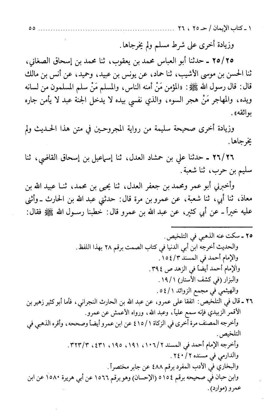 25 - حَدَّثَنَا أَبُو الْعَبَّاسِ مُحَمَّدُ بْنُ يَعْقُوبَ، ثنا مُحَمَّدُ بْنُ إِسْحَاقَ الصَّغَانِيُّ، ثنا الْحَسَنُ بْنُ مُوسَى الْأَشْيَبُ، ثنا حَمَّادٌ، عَنْ يُونُسَ بْنِ عُبَيْدٍ، وَحُمَيْدٍ، عَنْ أَنَسِ بْنِ مَالِكٍ، قَالَ: قَالَ رَسُولُ اللَّهِ صَلَّى اللهُ عَلَيْهِ وَسَلَّمَ: «§الْمُؤْمِنُ مَنْ أَمِنَهُ النَّاسُ، وَالْمُسْلِمُ مَنْ سَلِمَ الْمُسْلِمُونَ مِنْ لِسَانِهِ وَيَدِهِ، وَالْمُهَاجِرُ مَنْ هَجَرَ السُّوءَ، وَالَّذِي نَفْسِي بِيَدِهِ لَا يَدْخُلُ الْجَنَّةَ عَبْدٌ لَا يَأْمَنُ جَارُهُ بَوَائِقَهُ» . «وَزِيَادَةٌ أُخْرَى صَحِيحَةٌ سَلِيمَةٌ مِنْ رِوَايَةِ الْمَجْرُوحِينَ فِي مَتْنِ هَذَا الْحَدِيثِ وَلَمْ يُخَرِّجَاهَا» K25 - سكت عنه الذهبي في التلخيص