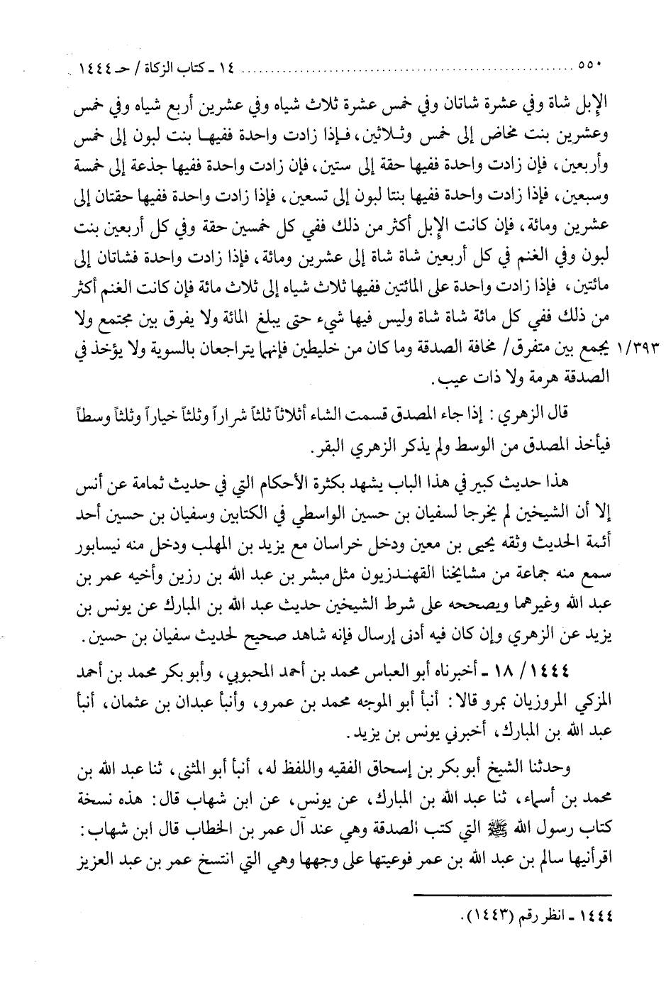1444 - أَخْبَرْنَاهُ أَبُو الْعَبَّاسِ مُحَمَّدُ بْنُ أَحْمَدَ الْمَحْبُوبِيُّ، وَأَبُو بَكْرٍ مُحَمَّدُ بْنُ أَحْمَدَ الْمُزَكِّي الْمَرْوَزِيَّانِ بِمَرْوَ، قَالَا: أَنْبَأَ أَبُو الْمُوَجِّهِ مُحَمَّدُ بْنُ عَمْرٍو، وَأَنْبَأَ عَبْدَانُ بْنُ عُثْمَانَ، أَنْبَأَ عَبْدُ اللَّهِ بْنُ الْمُبَارَكِ، أَخْبَرَنِي يُونُسُ بْنُ يَزِيدَ، وَحَدَّثَنَا الشَّيْخُ أَبُو بَكْرِ بْنُ إِسْحَاقَ الْفَقِيهُ، وَاللَّفْظُ لَهُ، أَنْبَأَ أَبُو الْمُثَنَّى، ثنا عَبْدُ اللَّهِ بْنُ مُحَمَّدِ بْنِ أَسْمَاءَ، ثنا عَبْدُ اللَّهِ بْنُ الْمُبَارَكِ، عَنْ يُونُسَ، عَنِ ابْنِ شِهَابٍ، قَالَ: هَذِهِ نُسْخَةُ كِتَابِ رَسُولِ اللَّهِ صَلَّى اللهُ عَلَيْهِ وَسَلَّمَ الَّتِي كَتَبَ الصَّدَقَةَ وَهِيَ عِنْدَ آلِ عُمَرَ بْنِ الْخَطَّابِ، قَالَ: ابْنُ شِهَابٍ أَقْرَأَنِيهَا سَالِمُ بْنُ عَبْدِ اللَّهِ بْنِ عُمَرَ فَوَعَيْتُهَا عَلَى وَجْهِهَا وَهِيَ الَّتِي انْتَسَخَ عُمَرُ بْنُ عَبْدِ الْعَزِيزِ مِنْ عَبْدِ اللَّهِ بْنِ عَبْدِ اللَّهِ بْنِ عُمَرَ وَسَالِمِ بْنِ عَبْدِ اللَّهِ حِينَ أُمِّرَ عَلَى الْمَدِينَةِ، فَأَمَرَ عُمَّالَهُ بِالْعَمَلِ بِهَا، وَكَتَبَ بِهَا إِلَى الْوَلِيدِ، فَأَمَرَ الْوَلِيدُ عُمَّالَهُ بِالْعَمَلِ بِهَا، ثُمَّ لَمْ يَزَلِ الْخُلَفَاءُ يَأْمُرُونَ بِذَلِكَ بَعْدَهُ، ثُمَّ أَمَرَ بِهَا هِشَامٌ فَنَسَخَهَا إِلَى كُلِّ عَامِلٍ مِنَ الْمُسْلِمِينَ، وَأَمَرَهُمْ بِالْعَمَلِ بِمَا فِيهَا، وَلَا يَتَعَدَّوْنَهَا، وَهَذَا كِتَابٌ يُفَسِّرُهُ، §«لَا يُؤْخَذُ فِي شَيْءٍ مِنَ الْإِبِلِ الصَّدَقَةُ حَتَّى تَبْلُغَ خَمْسَ ذَوْدٍ، فَإِذَا بَلَغَتْ خَمْسًا فَفِيهَا شَاةٌ حَتَّى تَبْلُغَ عَشْرًا، فَإِذَا بَلَغَتْ عَشْرًا فَفِيهَا شَاتَانِ حَتَّى تَبْلُغَ خَمْسَ عَشْرَةَ، فَإِذَا بَلَغَتْ خَمْسَ عَشْرَةَ فَفِيهَا أَرْبَعُ شِيَاهٍ حَتَّى تَبْلُغَ خَمْسًا وَعِشْرِينَ، فَإِذَا بَلَغَتْ خَمْسًا وَعِشْرِينَ أُفْرِضَتْ فَكَانَ فِيهَا فَرِيضَةٌ بِنْتُ مَخَاضٍ، فَإِنْ لَمْ يُوجَدْ بِنْتُ مَخَاضٍ فَابْنُ لَبُونٍ ذَكَرٌ حَتَّى تَبْلُغَ خَمْسًا وَثَلَاثِينَ، فَإِذَا بَلَغَتْ سِتًّا وَثَلَاثِينَ فَفِيهَا بِنْتُ لَبُونٍ حَتَّى تَبْلُغَ خَمْسًا وَأَرْبَعِينَ، فَإِذَا كَانَتْ سِتًّا وَأَرْبَعِينَ فَفِيهَا حِقَّةٌ طَرُوقَةُ الْجَمَلِ حَتَّى تَبْلُغَ سِتِّينَ، فَإِذَا كَانَتْ إِحْدَى وَسِتِّينَ فَفِيهَا جَذَعَةٌ حَتَّى تَبْلُغَ خَمْسًا وَسَبْعِينَ، فَإِذَا بَلَغَتْ سِتًّا وَسَبْعِينَ فَفِيهَا بِنْتُ لَبُونٍ حَتَّى تَبْلُغَ تِسْعِينَ، فَإِذَا كَانَتْ إِحْدَى وَتِسْعِينَ فَفِيهَا حِقَّتَانِ طَرُوقَتَا الْجَمَلِ حَتَّى تَبْلُغَ عِشْرِينَ وَمِائَةً، فَإِذَا كَانَتْ إِحْدَى وَعِشْرِينَ وَمِائَةً فَفِيهَا ثَلَاثُ بَنَاتِ لَبُونٍ حَتَّى تَبْلُغَ تِسْعًا وَعِشْرِينَ وَمِائَةً، فَإِذَا كَانَتْ ثَلَاثِينَ وَمِائَةً فَفِيهَا بِنْتَا لَبُونٍ، وَحِقَّةٌ حَتَّى تَبْلُغَ تِسْعًا وَثَلَاثِينَ وَمِائَةً، فَإِذَا كَانَتْ أَرْبَعِينَ وَمِائَةً فَفِيهَا حِقَّتَانِ وَبِنْتُ لَبُونٍ حَتَّى تَبْلُغَ تِسْعًا وَأَرْبَعِينَ وَمِائَةً، فَإِذَا كَانَتْ خَمْسِينَ وَمِائَةً فَفِيهَا ثَلَاثُ حِقَاقٍ حَتَّى تَبْلُغَ تِسْعًا وَخَمْسِينَ وَمِائَةً، فَإِذَا كَانَتْ سِتِّينَ وَمِائَةً فَفِيهَا أَرْبَعُ بَنَاتِ لَبُونٍ حَتَّى تَبْلُغَ تِسْعًا وَسِتِّينَ وَمِائَةً، فَإِذَا كَانَتْ سَبْعِينَ وَمِائَةً فَفِيهَا ثَلَاثُ بَنَاتِ لَبُونٍ وَحِقَّةٌ حَتَّى تَبْلُغَ تِسْعًا وَسَبْعِينَ وَمِائَةً، فَإِذَا كَانَتْ ثَمَانِينَ وَمِائَةً فَفِيهَا حِقَّتَانِ وَابْنَتَا لَبُونٍ حَتَّى تَبْلُغَ تِسْعًا وَثَمَانِينَ وَمِائَةً، 