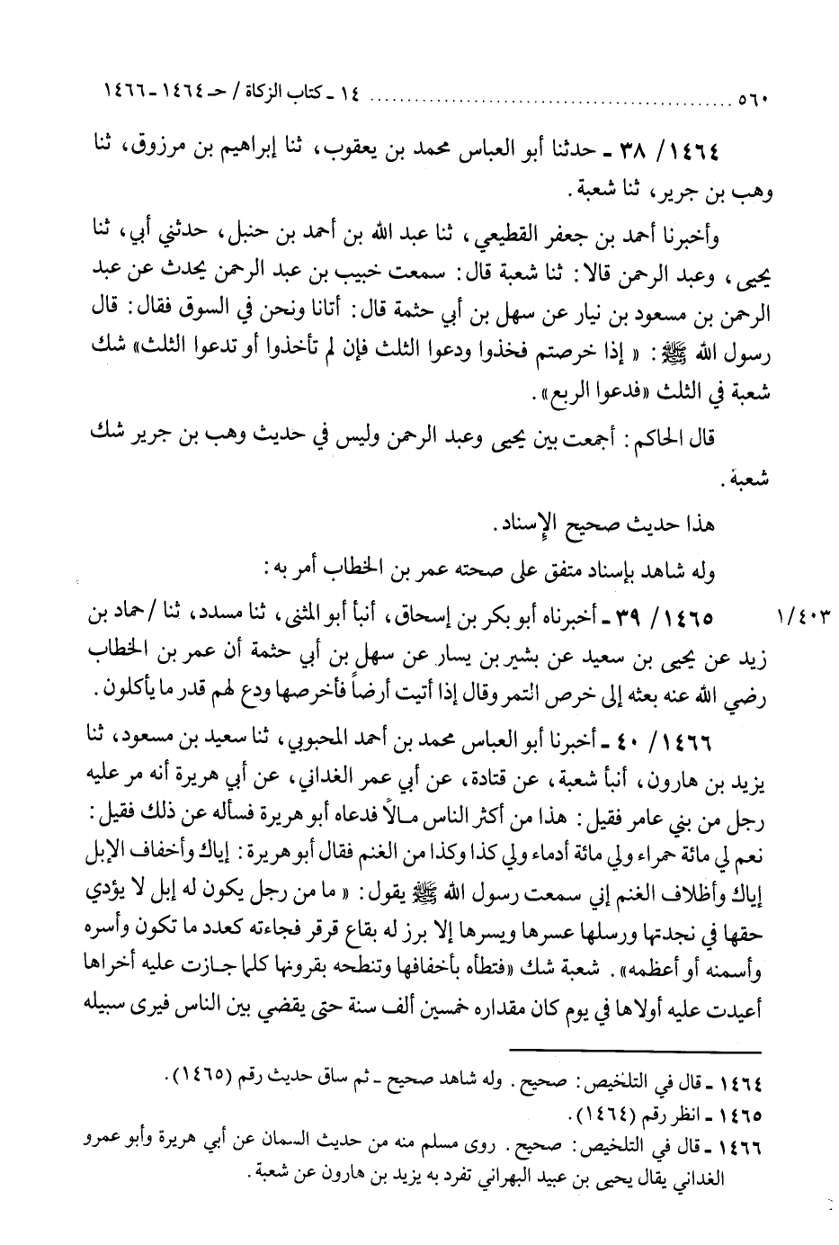 1464 - حَدَّثَنَا أَبُو الْعَبَّاسِ مُحَمَّدُ بْنُ يَعْقُوبَ، ثنا إِبْرَاهِيمُ بْنُ مَرْزُوقٍ، ثنا وَهْبُ بْنُ جَرِيرٍ، ثنا شُعْبَةُ، وَأَخْبَرَنَا أَحْمَدُ بْنُ جَعْفَرٍ الْقَطِيعِيُّ، ثنا عَبْدُ اللَّهِ بْنُ أَحْمَدَ بْنِ حَنْبَلٍ، حَدَّثَنِي أَبِي، ثنا يَحْيَى، وَعَبْدُ الرَّحْمَنِ، قَالَا: ثنا شُعْبَةُ، قَالَ: سَمِعْتُ خُبَيْبَ بْنَ عَبْدِ الرَّحْمَنِ، يُحَدِّثُ عَنْ عَبْدِ الرَّحْمَنِ بْنِ مَسْعُودِ بْنِ نِيَارٍ، عَنْ سَهْلِ بْنِ أَبِي حَثْمَةَ، قَالَ: أَتَانَا وَنَحْنُ فِي السُّوقِ، فَقَالَ: قَالَ رَسُولُ اللَّهِ صَلَّى اللهُ عَلَيْهِ وَسَلَّمَ: «§إِذَا خَرَصْتُمْ فَخُذُوا، وَدَعُوا الثُّلُثَ، فَإِنْ لَمْ تَأْخُذُوا أَوْ تَدَعُو الثُّلُثَ - شَكَّ شُعْبَةُ فِي الثُّلُثِ - فَدَعُوا الرُّبُعَ» قَالَ الْحَاكِمُ: «أَجْمَعْتَ بَيْنَ يَحْيَى وَعَبْدِ الرَّحْمَنِ وَلَيْسَ فِي حَدِيثِ وَهْبِ بْنِ جَرِيرٍ شَكَّ شُعْبَةُ، هَذَا حَدِيثٌ صَحِيحُ الْإِسْنَادِ» وَلَهُ شَاهِدٌ بِإِسْنَادٍ مُتَّفَقٍ عَلَى صِحَّتِهِ عُمَرُ بْنُ الْخَطَّابِ أَمَرَ بِهِ