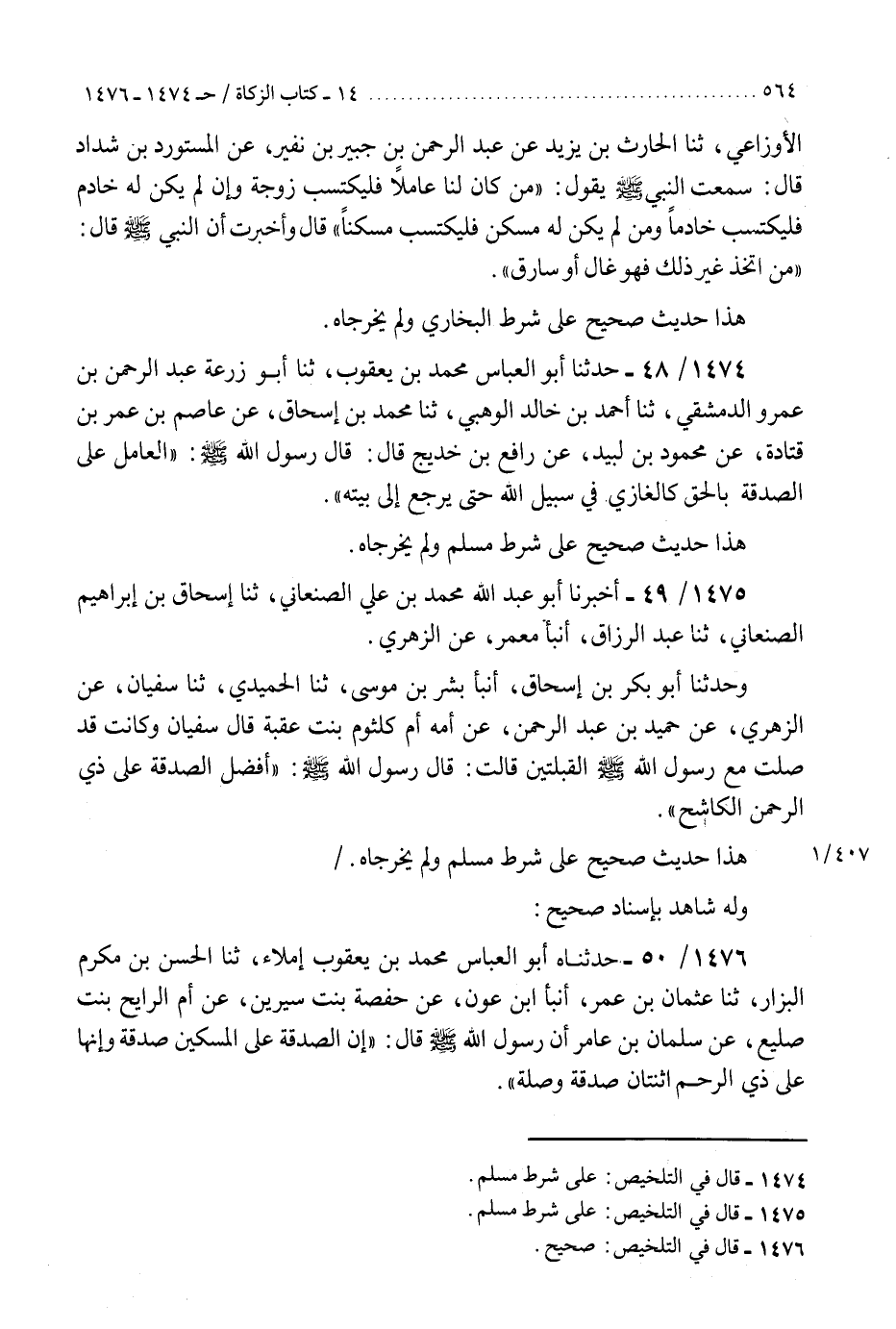 1474 - حَدَّثَنَا أَبُو الْعَبَّاسِ مُحَمَّدُ بْنُ يَعْقُوبَ، ثنا أَبُو زُرْعَةَ عَبْدُ الرَّحْمَنِ بْنُ عَمْرٍو الدِّمَشْقِيُّ، ثنا أَحْمَدُ بْنُ خَالِدٍ الْوَهْبِيُّ، ثنا مُحَمَّدُ بْنُ إِسْحَاقَ، عَنْ عَاصِمِ بْنِ عُمَرَ بْنِ قَتَادَةَ، عَنْ مَحْمُودِ بْنِ لَبِيدٍ، عَنْ رَافِعِ بْنِ خَدِيجٍ، قَالَ: قَالَ رَسُولُ اللَّهِ صَلَّى اللهُ عَلَيْهِ وَسَلَّمَ: §«الْعَامِلُ عَلَى الصَّدَقَةِ بِالْحَقِّ كَالْغَازِي فِي سَبِيلِ اللَّهِ حَتَّى يَرْجِعَ إِلَى بَيْتِهِ» هَذَا حَدِيثٌ صَحِيحٌ عَلَى شَرْطِ مُسْلِمٍ، وَلَمْ يُخَرِّجَاهُ "