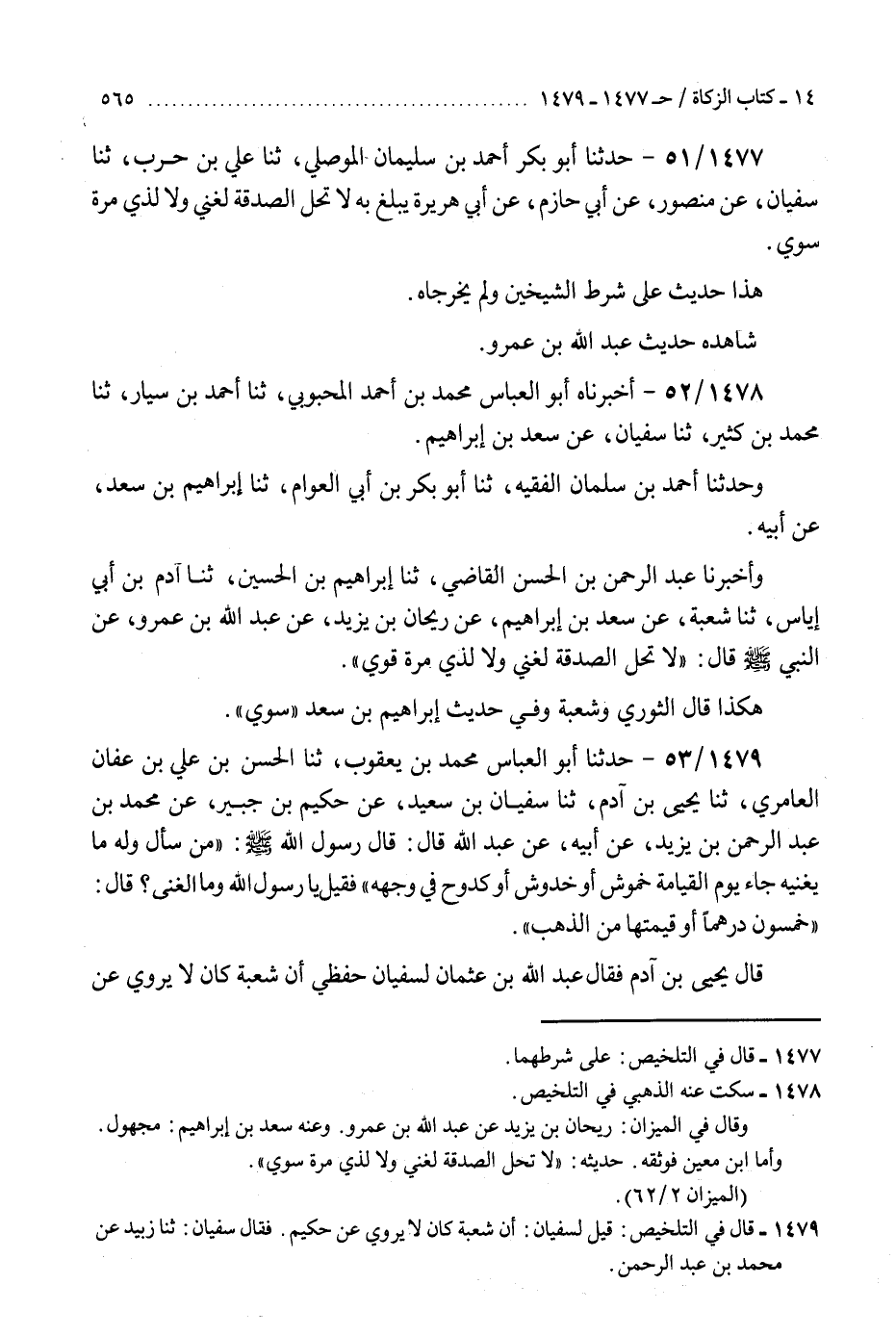 1477 - حَدَّثَنَا أَبُو بَكْرٍ أَحْمَدُ بْنُ سُلَيْمَانَ الْمَوْصِلِيُّ، ثنا عَلِيُّ بْنُ حَرْبٍ، ثنا سُفْيَانُ، عَنْ مَنْصُورٍ، عَنْ أَبِي حَازِمٍ، عَنْ أَبِي هُرَيْرَةَ، يَبْلُغُ بِهِ «§لَا تَحِلُّ الصَّدَقَةُ لِغَنِيٍّ، وَلَا لِذِي مِرَّةٍ سَوِيٍّ» هَذَا حَدِيثٌ عَلَى شَرْطِ الشَّيْخَيْنِ، وَلَمْ يُخَرِّجَاهُ " شَاهِدُهُ حَدِيثُ عَبْدِ اللَّهِ بْنِ عَمْرٍو