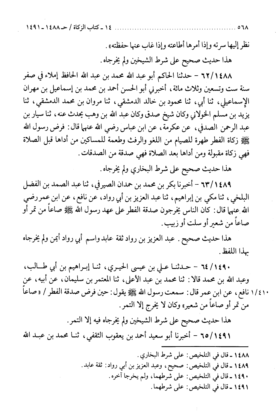 1488 - حَدَّثَنَا الْحَاكِمُ أَبُو عَبْدِ اللَّهِ مُحَمَّدُ بْنُ عَبْدِ اللَّهِ الْحَافِظُ إِمْلَاءً فِي صَفَرٍ سَنَةَ سِتٍّ وَتِسْعِينَ وَثَلَاثِ مَائَةٍ أَخْبَرَنِي أَبُو الْحَسَنِ أَحْمَدُ بْنُ مُحَمَّدِ بْنِ إِسْمَاعِيلَ بْنِ مِهْرَانَ الْإِسْمَاعِيلِيُّ، ثنا أَبِي، ثنا مَحْمُودُ بْنُ خَالِدٍ الدِّمَشْقِيُّ، ثنا مَرْوَانُ بْنُ مُحَمَّدٍ الدِّمَشْقِيِّ، ثنا يَزِيدُ بْنُ مُسْلِمٍ الْخَوْلَانِيُّ وَكَانَ شَيْخَ صِدْقٍ وَكَانَ عَبْدُ اللَّهِ بْنُ وَهْبٍ يُحَدِّثُ عَنْهُ ثنا سَيَّارُ بْنُ عَبْدِ الرَّحْمَنِ الصَّدَفِيُّ، عَنْ عِكْرِمَةَ، عَنِ ابْنِ عَبَّاسٍ رَضِيَ اللَّهُ عَنْهُمَا، قَالَ: §«فَرَضَ رَسُولُ اللَّهِ صَلَّى اللهُ عَلَيْهِ وَسَلَّمَ زَكَاةَ الْفِطْرِ طُهْرَةً لِلصِّيَامِ مِنَ اللَّغْوِ، وَالرَّفَثِ، وَطُعْمَةً لِلْمَسَاكِينِ، مَنْ أَدَّاهَا قَبْلَ الصَّلَاةِ فَهِيَ زَكَاةٌ مَقْبُولَةٌ، وَمَنْ أَدَّاهَا بَعْدَ الصَّلَاةِ فَهِيَ صَدَقَةٌ مِنَ الصَّدَقَاتِ» هَذَا حَدِيثٌ صَحِيحٌ عَلَى شَرْطِ الْبُخَارِيِّ، وَلَمْ يُخَرِّجَاهُ "K1488 - على شرط البخاري