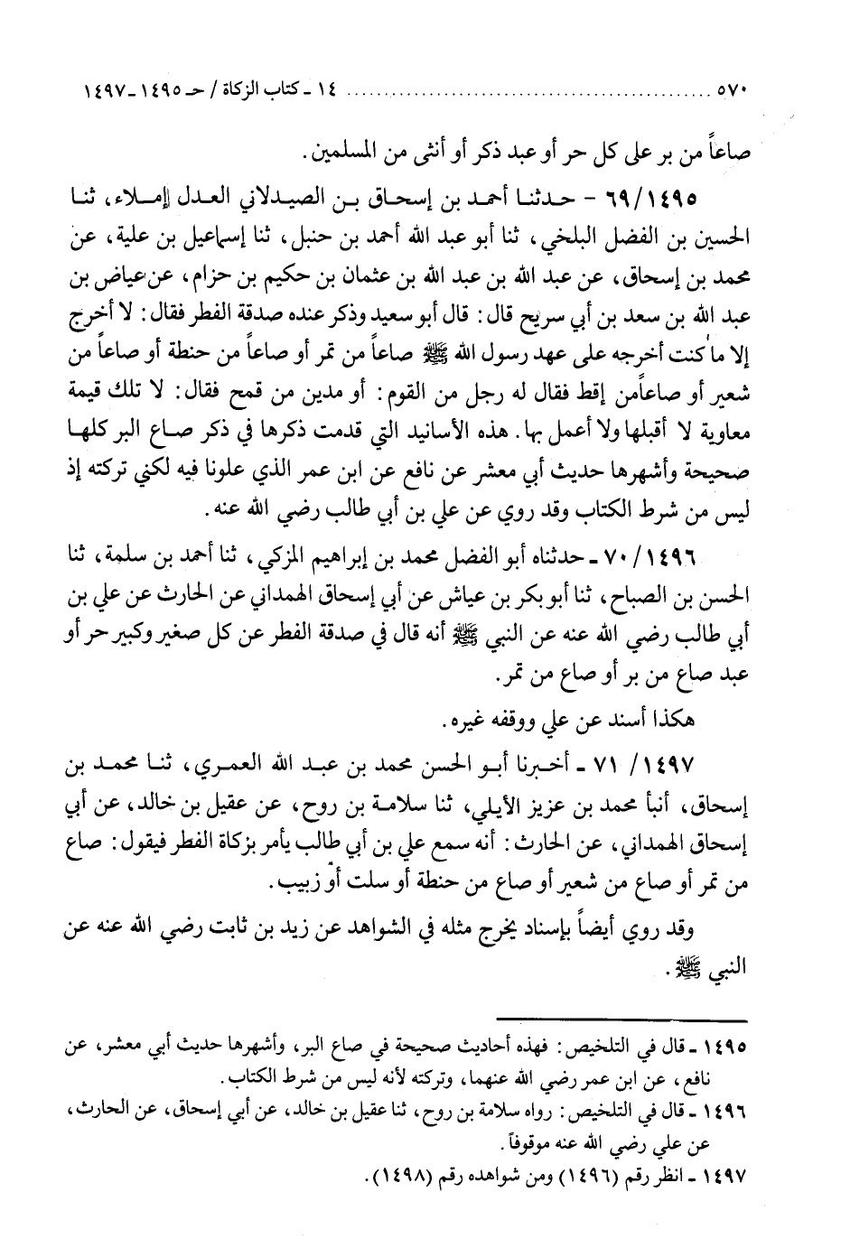 1496 - حَدَّثَنَاهُ أَبُو الْفَضْلِ مُحَمَّدُ بْنُ إِبْرَاهِيمَ الْمُزَكِّي، ثنا أَحْمَدُ بْنُ سَلَمَةَ، ثنا الْحَسَنُ بْنُ الصَّبَّاحِ، ثنا أَبُو بَكْرِ بْنُ عَيَّاشٍ، عَنْ أَبِي إِسْحَاقَ الْهَمْدَانِيِّ، عَنِ الْحَارِثِ، عَنْ عَلِيِّ بْنِ أَبِي طَالِبٍ، رَضِيَ اللَّهُ عَنْهُ، عَنِ النَّبِيِّ صَلَّى اللهُ عَلَيْهِ وَسَلَّمَ أَنَّهُ قَالَ فِي " §صَدَقَةِ الْفِطْرِ: عَنْ كُلِّ صَغِيرٍ وَكَبِيرٍ، حُرٍّ أَوْ عَبْدٍ، صَاعٌ مِنْ بُرٍّ، أَوْ صَاعٌ مِنْ تَمْرٍ «هَكَذَا أُسْنِدَ عَنْ عَلِيٍّ، وَوَقَفَهُ غَيْرُهُ»