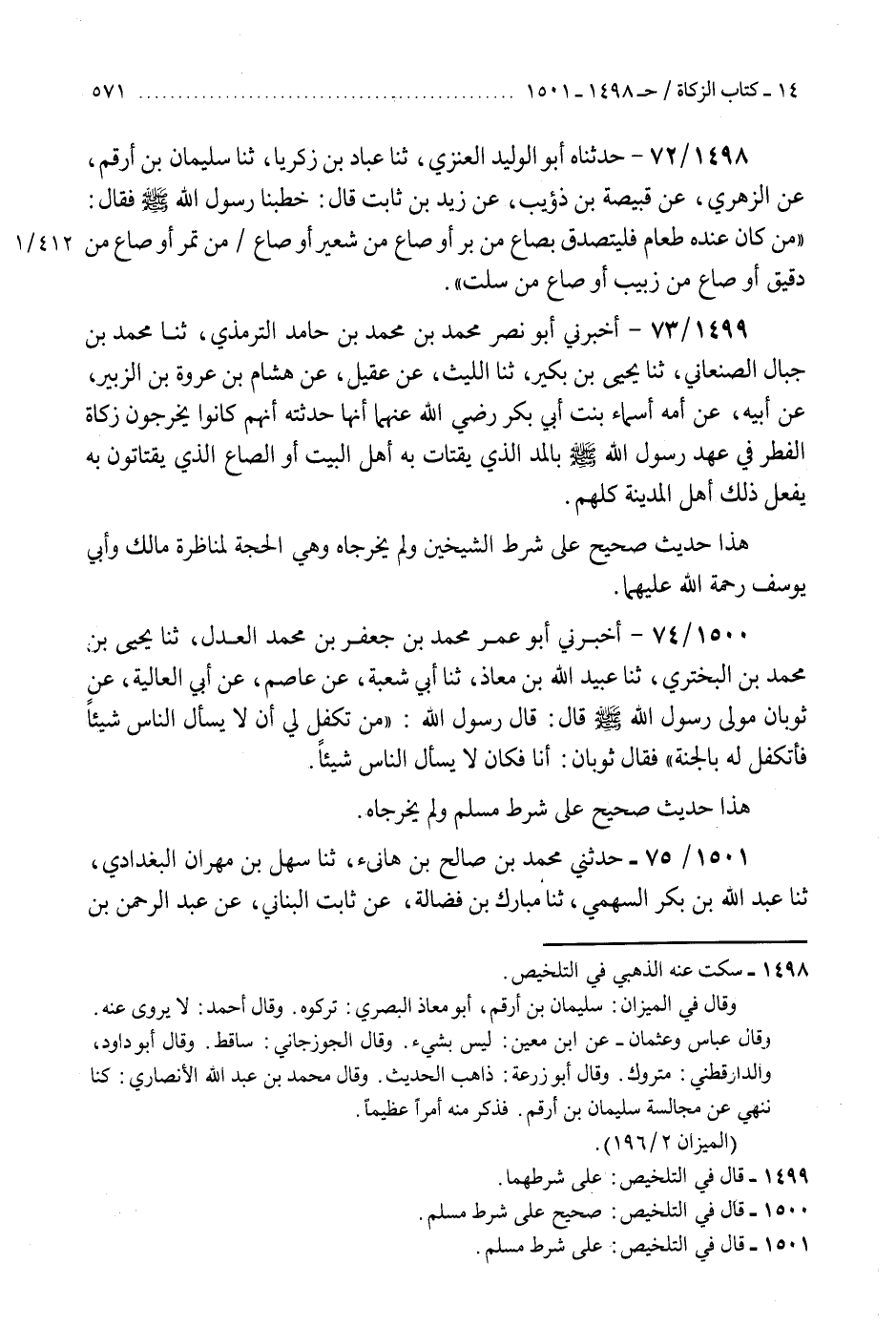 1499 - أَخْبَرَنِي أَبُو نَصْرٍ مُحَمَّدُ بْنُ مُحَمَّدِ بْنِ حَامِدٍ التِّرْمِذِيُّ، ثنا مُحَمَّدُ بْنُ جِبَالٍ الصَّنْعَانِيُّ، ثنا يَحْيَى بْنُ بُكَيْرٍ، ثنا اللَّيْثُ، عَنْ عَقِيلٍ، عَنْ هِشَامِ بْنِ عُرْوَةَ بْنِ الزُّبَيْرِ، عَنْ أَبِيهِ، عَنْ أُمِّهِ أَسْمَاءَ بِنْتِ أَبِي بَكْرٍ رَضِيَ اللَّهُ عَنْهُمَا أَنَّهَا حَدَّثَتْهُ، أَنَّهُمْ كَانُوا §«يُخْرِجُونَ زَكَاةَ الْفِطْرِ فِي عَهْدِ رَسُولِ اللَّهِ صَلَّى اللهُ عَلَيْهِ وَسَلَّمَ بِالْمُدِّ الَّذِي يَقْتَاتُ بِهِ أَهْلُ الْبَيْتِ، أَوِ الصَّاعِ الَّذِي يَقْتَاتُونَ بِهِ، يَفْعَلُ ذَلِكَ أَهْلُ الْمَدِينَةِ كُلُّهُمْ» هَذَا حَدِيثٌ صَحِيحٌ عَلَى شَرْطِ الشَّيْخَيْنِ، وَلَمْ يُخَرِّجَاهُ، وَهِيَ الْحُجَّةُ لِمُنَاظَرَةِ مَالِكٍ وَأَبِي يُوسُفَ رَحْمَةُ اللَّهِ عَلَيْهِمَا "