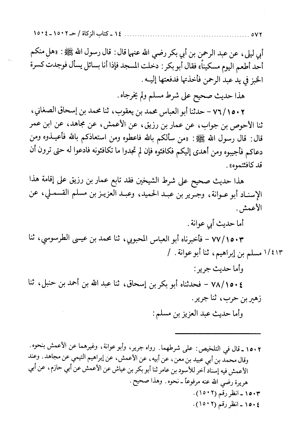 1502 - حَدَّثَنَا أَبُو الْعَبَّاسِ مُحَمَّدُ بْنُ يَعْقُوبَ، ثنا مُحَمَّدُ بْنُ إِسْحَاقَ الصَّغَانِيُّ، ثنا الْأَحْوَصُ بْنُ جَوَّابٍ، عَنْ عَمَّارِ بْنِ زُرَيْقٍ، عَنِ الْأَعْمَشِ، عَنْ مُجَاهِدٍ، عَنِ ابْنِ عُمَرَ، قَالَ: قَالَ رَسُولُ اللَّهِ صَلَّى اللهُ عَلَيْهِ وَسَلَّمَ: «§مَنْ سَأَلَكُمْ بِاللَّهِ فَأَعْطُوهُ، وَمَنِ اسْتَعَاذَكُمْ بِاللَّهِ فَأَعِيذُوهُ، وَمَنْ دَعَاكُمْ فَأَجِيبُوهُ، وَمَنْ أَهْدَى إِلَيْكُمْ فَكَافِئُوهُ، فَإِنْ لَمْ تَجِدُوا مَا تُكَافِئُونَهُ فَادْعُوا لَهُ حَتَّى تَرَوْنَ أَنْ قَدْ كَافَأْتُمُوهُ» هَذَا حَدِيثٌ صَحِيحٌ عَلَى شَرْطِ الشَّيْخَيْنِ " فَقَدْ تَابَعَ عَمَّارَ بْنَ زُرَيْقٍ عَلَى إِقَامَةِ هَذَا الْإِسْنَادِ: أَبُو عَوَانَةَ، وَجَرِيرُ بْنُ عَبْدِ الْحَمِيدِ، وَعَبْدُ الْعَزِيزِ بْنُ مُسْلِمٍ الْقَسْمَلِيُّ، عَنِ الْأَعْمَشِ، أَمَّا حَدِيثُ أَبِي عَوَانَةَ
