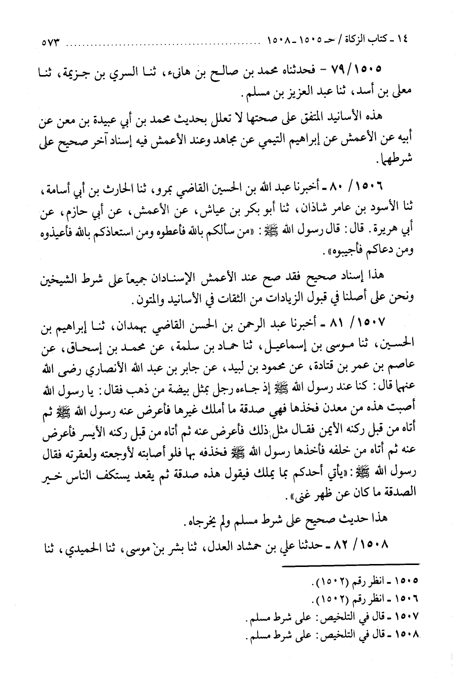 1506 - أَخْبَرَنَا عَبْدُ اللَّهِ بْنُ الْحُسَيْنِ الْقَاضِي بِمَرْوَ، ثنا الْحَارِثُ بْنُ أَبِي أُسَامَةَ، ثنا الْأَسْوَدُ بْنُ عَامِرِ بْنِ شَاذَانَ، ثنا أَبُو بَكْرِ بْنُ عَيَّاشٍ، عَنِ الْأَعْمَشِ، عَنْ أَبِي حَازِمٍ، عَنْ أَبِي هُرَيْرَةَ، قَالَ: قَالَ رَسُولُ اللَّهِ صَلَّى اللهُ عَلَيْهِ وَسَلَّمَ: «§مَنْ سَأَلَكُمْ بِاللَّهِ فَأَعْطُوهُ، وَمَنِ اسْتَعَاذَكُمْ بِاللَّهِ فَأَعِيذُوهُ، وَمَنْ دَعَاكُمْ فَأَجِيبُوهُ» هَذَا إِسْنَادٌ صَحِيحٌ، فَقَدْ صَحَّ عِنْدَ الْأَعْمَشِ الْإِسْنَادَانِ جَمِيعًا عَلَى شَرْطِ الشَّيْخَيْنِ، وَنَحْنُ عَلَى أَصْلِنَا فِي قَبُولِ الزِّيَادَاتِ مِنَ الثِّقَاتِ فِي الْأَسَانِيدِ وَالْمُتُونِ "