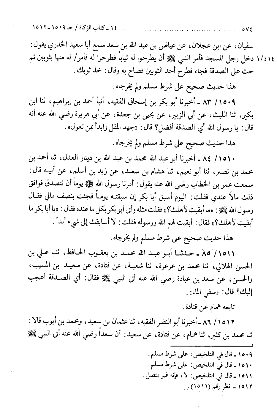1512 - أَخْبَرَنَا أَبُو النَّضْرِ الْفَقِيهُ، ثنا عُثْمَانُ بْنُ سَعِيدٍ، وَمُحَمَّدُ بْنُ أَيُّوبَ، قَالَا: ثنا مُحَمَّدُ بْنُ كَثِيرٍ، ثنا هَمَّامٌ، عَنْ قَتَادَةَ، عَنْ سَعِيدٍ، أَنَّ سَعْدًا، رَضِيَ اللَّهُ عَنْهُ أَتَى النَّبِيَّ صَلَّى اللهُ عَلَيْهِ وَسَلَّمَ، فَقَالَ: §أَيُّ الصَّدَقَةِ أَعْجَبُ إِلَيْكَ؟ فَقَالَ: «الْمَاءُ» هَذَا حَدِيثٌ صَحِيحٌ عَلَى شَرْطِ الشَّيْخَيْنِ، وَلَمْ يُخَرِّجَاهُ "