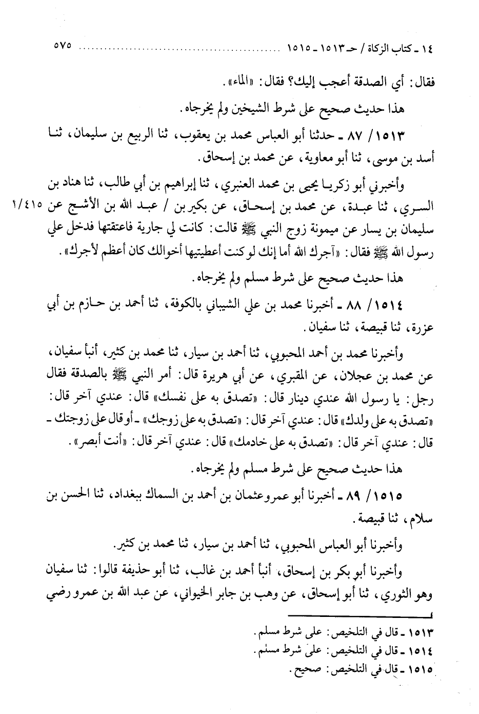 1513 - حَدَّثَنَا أَبُو الْعَبَّاسِ مُحَمَّدُ بْنُ يَعْقُوبَ، ثنا الرَّبِيعُ بْنُ سُلَيْمَانَ، ثنا أَسَدُ بْنُ مُوسَى، ثنا أَبُو مُعَاوِيَةَ، عَنْ مُحَمَّدِ بْنِ إِسْحَاقَ، وَأَخْبَرَنِي أَبُو زَكَرِيَّا يَحْيَى بْنُ مُحَمَّدٍ الْعَنْبَرِيُّ، ثنا إِبْرَاهِيمُ بْنُ أَبِي طَالِبٍ، ثنا هَنَّادُ بْنُ السَّرِيِّ، ثنا عَبْدَةُ، عَنْ مُحَمَّدِ بْنِ إِسْحَاقَ، عَنْ بُكَيْرِ بْنِ عَبْدِ اللَّهِ بْنِ الْأَشَجِّ، عَنْ سُلَيْمَانَ بْنِ يَسَارٍ، عَنْ مَيْمُونَةَ، زَوْجِ النَّبِيِّ صَلَّى اللهُ عَلَيْهِ وَسَلَّمَ قَالَتْ: كَانَتْ لِي جَارِيَةٌ فَأَعْتَقْتُهَا، فَدَخَلَ عَلَيَّ رَسُولُ اللَّهِ صَلَّى اللهُ عَلَيْهِ وَسَلَّمَ فَقَالَ: «§آجَرَكِ اللَّهُ، أَمَا إِنَّكِ لَوْ كُنْتِ أَعْطَيْتِيهَا أَخْوَالَكِ كَانَ أَعْظَمَ لِأَجْرِكِ» هَذَا حَدِيثٌ صَحِيحٌ عَلَى شَرْطِ مُسْلِمٍ، وَلَمْ يُخَرِّجَاهُ "
