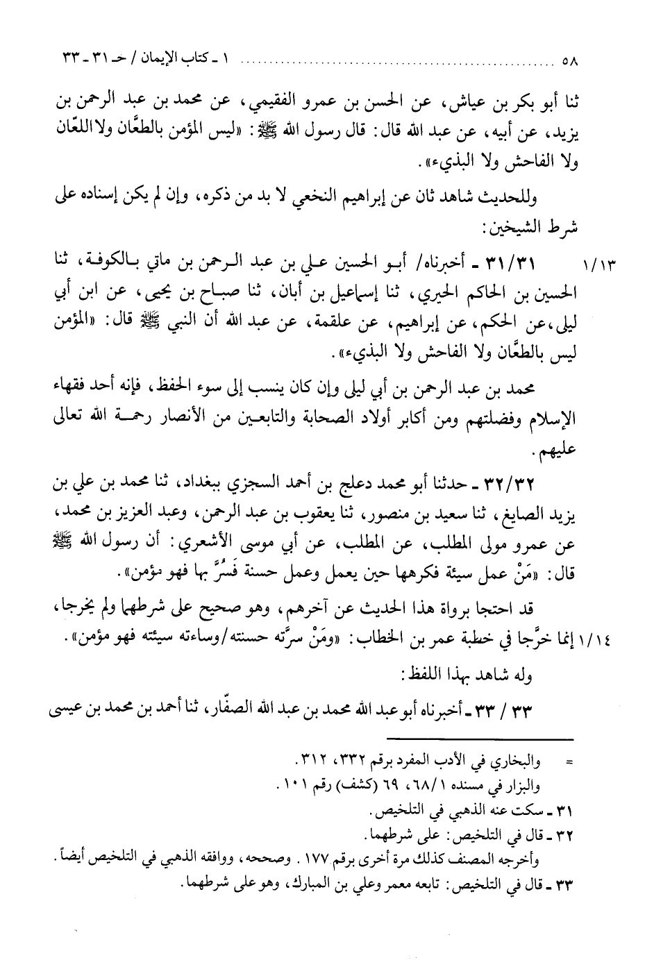 32 - حَدَّثَنَا أَبُو مُحَمَّدٍ دَعْلَجُ بْنُ أَحْمَدَ السِّجْزِيُّ بِبَغْدَادَ، ثنا مُحَمَّدُ بْنُ عَلِيِّ بْنِ يَزِيدَ الصَّايِغُ، ثنا سَعِيدُ بْنُ مَنْصُورٍ، ثنا يَعْقُوبُ بْنُ عَبْدِ الرَّحْمَنِ، وَعَبْدُ الْعَزِيزِ بْنُ مُحَمَّدٍ، عَنْ عَمْرٍو، مَوْلَى الْمُطَّلِبِ، عَنِ الْمُطَّلِبِ، عَنْ أَبِي مُوسَى الْأَشْعَرِيِّ، أَنَّ رَسُولَ اللَّهِ صَلَّى اللهُ عَلَيْهِ وَسَلَّمَ، قَالَ: «§مَنْ عَمِلَ سَيِّئَةً فَكَرِهَهَا حِينَ يَعْمَلُ، وَعَمِلَ حَسَنَةً فَسُرَّ بِهَا فَهُوَ مُؤْمِنٌ» . «قَدِ احْتَجَّا بِرُوَاةِ هَذَا الْحَدِيثِ عَنْ آخِرِهِمْ وَهُوَ صَحِيحٌ عَلَى شَرْطِهِمَا وَلَمْ يُخَرَّجَا إِنَّمَا خُرِّجَا فِي خُطْبَةِ عُمَرَ بْنِ الْخَطَّابِ، وَمَنْ سَرَّتْهُ حَسَنَتُهُ وَسَاءَتْهُ سَيِّئَتُهُ فَهُوَ مُؤْمِنٌ وَلَهُ شَاهِدٌ بِهَذَا اللَّفْظِ» K32 - على شرطهما