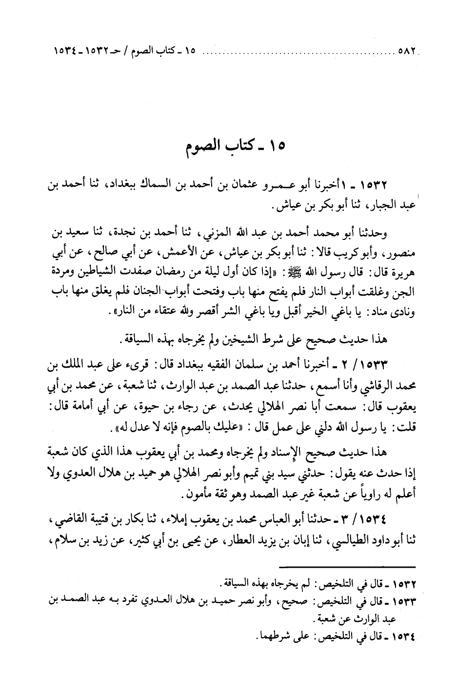1532 - أَخْبَرَنَا أَبُو عَمْرٍو عُثْمَانُ بْنُ أَحْمَدَ بْنِ السَّمَّاكِ بِبَغْدَادَ، ثنا أَحْمَدُ بْنُ عَبْدِ الْجَبَّارِ، ثنا أَبُو بَكْرِ بْنُ عَيَّاشٍ، وَحَدَّثَنَا أَبُو مُحَمَّدٍ أَحْمَدُ بْنُ عَبْدِ اللَّهِ الْمُزَنِيُّ، ثنا أَحْمَدُ بْنُ نَجْدَةَ، ثنا سَعِيدُ بْنُ مَنْصُورٍ، وَأَبُو كُرَيْبٍ، قَالَا: ثنا أَبُو بَكْرِ بْنُ عَيَّاشٍ، عَنِ الْأَعْمَشِ، عَنْ أَبِي صَالِحٍ، عَنْ أَبِي هُرَيْرَةَ، قَالَ: قَالَ رَسُولُ اللَّهِ صَلَّى اللهُ عَلَيْهِ وَسَلَّمَ: «§إِذَا كَانَ أَوَّلُ لَيْلَةٍ مِنْ رَمَضَانَ صُفِّدَتِ الشَّيَاطِينُ، وَمَرَدَةُ الْجِنِّ، وَغُلِّقَتْ أَبْوَابُ النَّارِ، فَلَمْ يُفْتَحْ مِنْهَا بَابٌ، وَفُتِحَتْ أَبْوَابُ الْجِنَانِ فَلَمْ يُغْلَقْ مِنْهَا بَابٌ، وَنَادَى مُنَادٍ يَا بَاغِيَ الْخَيْرِ أَقْبِلْ، وَيَا بَاغِيَ الشَّرِّ أَقْصِرْ، وَلِلَّهِ عُتَقَاءُ مِنَ النَّارِ» هَذَا حَدِيثٌ صَحِيحٌ عَلَى شَرْطِ الشَّيْخَيْنِ، وَلَمْ يُخَرِّجَاهُ بِهَذِهِ السِّيَاقَةِ "