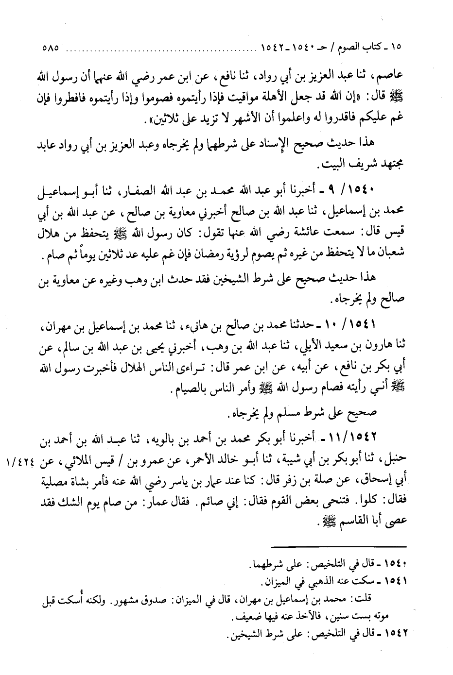 1540 - أَخْبَرَنَا أَبُو عَبْدِ اللَّهِ مُحَمَّدُ بْنُ عَبْدِ اللَّهِ الصَّفَّارُ، ثنا أَبُو إِسْمَاعِيلَ مُحَمَّدُ بْنُ إِسْمَاعِيلَ، ثنا عَبْدُ اللَّهِ بْنُ صَالِحٍ، أَخْبَرَنِي مُعَاوِيَةُ بْنُ صَالِحٍ، عَنْ عَبْدِ اللَّهِ بْنِ أَبِي قَيْسٍ، قَالَ: سَمِعْتُ عَائِشَةَ، رَضِيَ اللَّهُ عَنْهَا تَقُولُ: «كَانَ رَسُولُ اللَّهِ صَلَّى اللهُ عَلَيْهِ وَسَلَّمَ §يَتَحَفَّظُ مِنْ هِلَالِ شَعْبَانَ مَا لَا يَتَحَفَّظُ مِنْ غَيْرِهِ، ثُمَّ يَصُومُ لِرُؤْيَةِ رَمَضَانَ، فَإِنْ غُمَّ عَلَيْهِ عَدَّ ثَلَاثِينَ يَوْمًا، ثُمَّ صَامَ» هَذَا حَدِيثٌ صَحِيحٌ عَلَى شَرْطِ الشَّيْخَيْنِ، فَقَدْ حَدَّثَ ابْنُ وَهْبٍ وَغَيْرُهُ عَنْ مُعَاوِيَةَ بْنِ صَالِحٍ، وَلَمْ يُخَرِّجَاهُ "