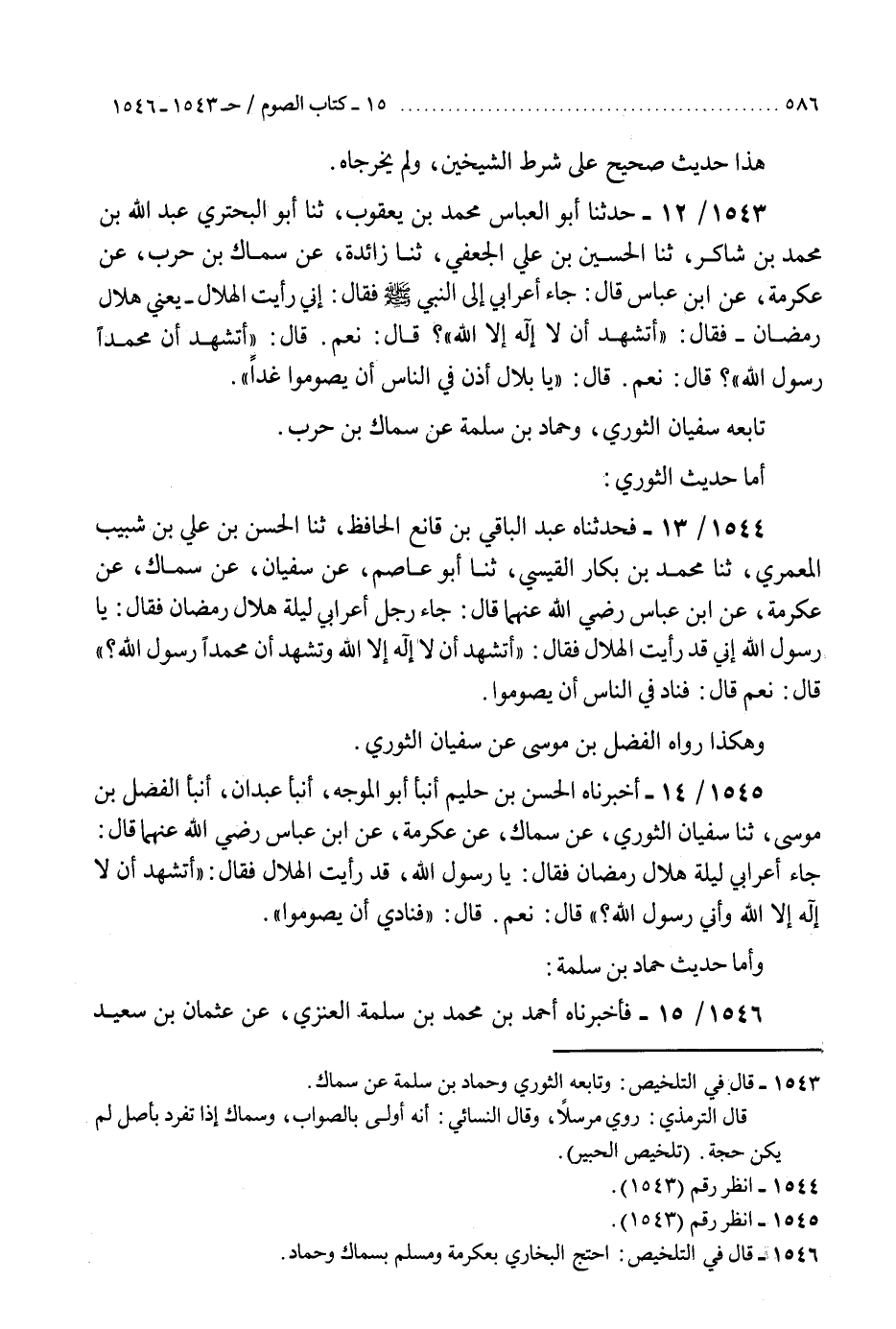 1546 - فَأَخْبَرَنَاهُ أَحْمَدُ بْنُ مُحَمَّدِ بْنِ سَلَمَةَ الْعَنَزِيُّ، عَنْ عُثْمَانَ بْنِ سَعِيدٍ الدَّارِمِيِّ، ثنا مُوسَى بْنُ إِسْمَاعِيلَ، ثنا حَمَّادُ بْنُ سَلَمَةَ، عَنْ سِمَاكٍ، عَنْ عِكْرِمَةَ، عَنِ ابْنِ عَبَّاسٍ، أَنَّهُمْ شَكَوْا فِي هِلَالِ رَمَضَانَ، فَأَرَادُوا أَنْ لَا يَقُومُوا وَلَا يَصُومُوا، فَجَاءَ أَعْرَابِيٌّ مِنَ الْحَرَّةِ فَشَهِدَ أَنَّهُ §رَأَى الْهِلَالَ «فَأَمَرَ النَّبِيُّ صَلَّى اللهُ عَلَيْهِ وَسَلَّمَ بِلَالًا أَنْ يَقُومُوا وَيَصُومُوا» قَدِ احْتَجَّ الْبُخَارِيُّ بِأَحَادِيثَ عِكْرِمَةَ، وَاحْتَجَّ مُسْلِمٌ بِأَحَادِيثِ سِمَاكِ بْنِ حَرْبٍ وَحَمَّادِ بْنِ سَلَمَةَ، وَهَذَا الْحَدِيثُ صَحِيحٌ، وَلَمْ يُخَرِّجَاهُ "