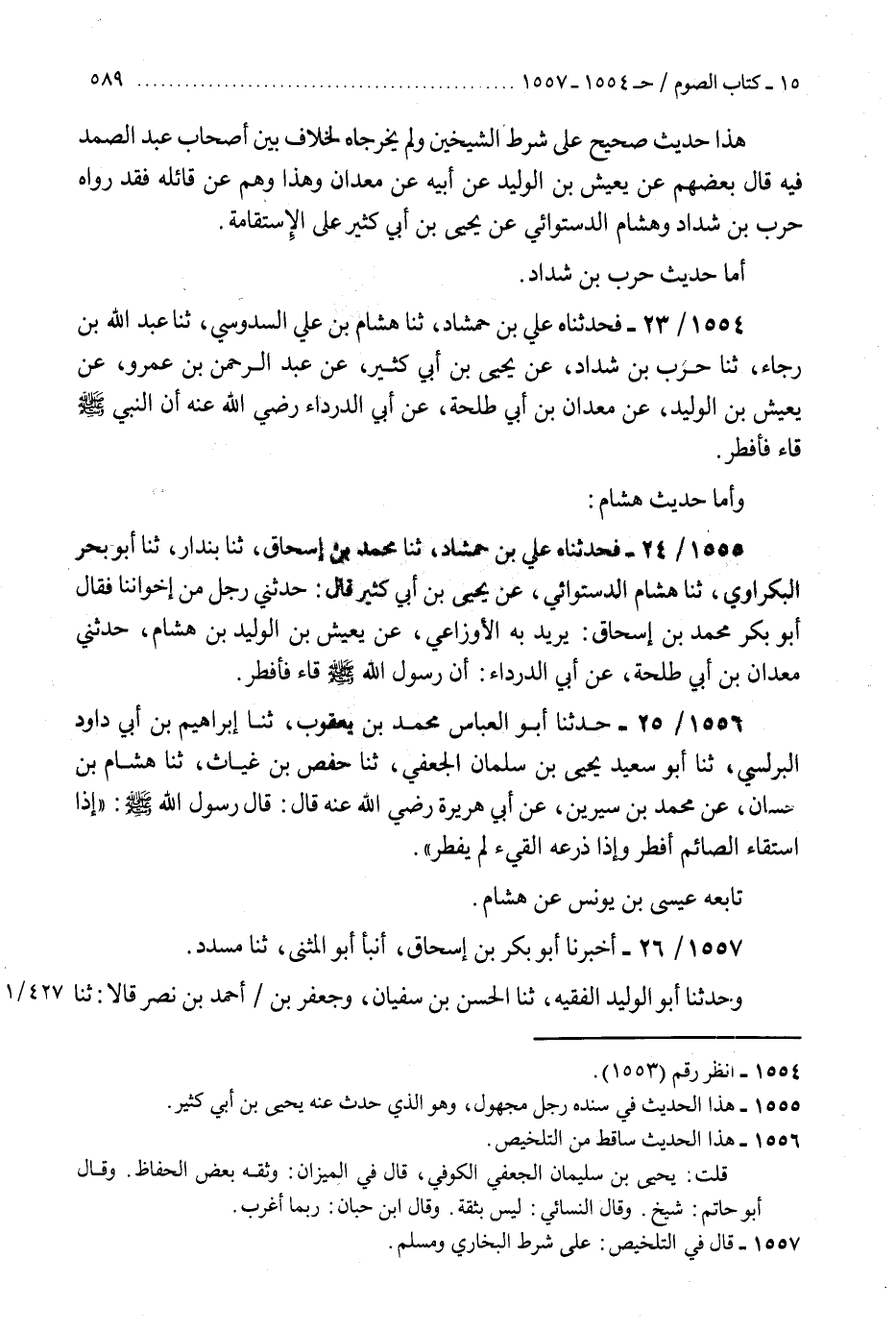 1556 - حَدَّثَنَا أَبُو الْعَبَّاسِ مُحَمَّدُ بْنُ يَعْقُوبَ، ثنا إِبْرَاهِيمُ بْنُ أَبِي دَاوُدَ الْبُرُلُّسِيُّ، ثنا أَبُو سَعِيدٍ يَحْيَى بْنُ سَلْمَانَ الْجُعْفِيُّ، ثنا حَفْصُ بْنُ غِيَاثٍ، ثنا هِشَامُ بْنُ حَسَّانَ، عَنْ مُحَمَّدِ بْنِ سِيرِينَ، عَنْ أَبِي هُرَيْرَةَ، رَضِيَ اللَّهُ عَنْهُ، قَالَ: قَالَ رَسُولُ اللَّهِ صَلَّى اللهُ عَلَيْهِ وَسَلَّمَ: «§إِذَا اسْتَقَاءَ الصَّائِمُ أَفْطَرَ، وَإِذَا ذَرَعَهُ الْقَيْءُ لَمْ يُفْطِرْ» تَابَعَهُ عِيسَى بْنُ يُونُسَ، عَنْ هِشَامٍ