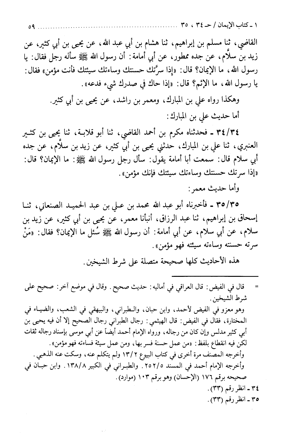 35 - فَأَخْبَرَنَاهُ أَبُو عَبْدِ اللَّهِ مُحَمَّدُ بْنُ عَلِيِّ بْنِ عَبْدِ الْحَمِيدِ الصَّنْعَانِيُّ، ثنا إِسْحَاقُ بْنُ إِبْرَاهِيمَ، ثنا عَبْدُ الرَّزَّاقِ، أَنْبَأَنَا مَعْمَرٌ، عَنْ يَحْيَى بْنِ أَبِي كَثِيرٍ، عَنْ زَيْدِ بْنِ سَلَّامٍ، عَنْ أَبِي سَلَّامٍ، عَنْ أَبِي أُمَامَةَ، أَنَّ رَسُولَ اللَّهِ صَلَّى اللهُ عَلَيْهِ وَسَلَّمَ سُئِلَ: مَا الْإِيمَانُ؟ فَقَالَ: «§مَنْ سَرَّتْهُ حَسَنَتُهُ، وَسَاءَتْهُ سَيِّئَتُهُ فَهُوَ مُؤْمِنٌ» . «هَذِهِ الْأَحَادِيثُ كُلُّهَا صَحِيحَةٌ مُتَّصِلَةٌ عَلَى شَرْطِ الشَّيْخَيْنِ»
