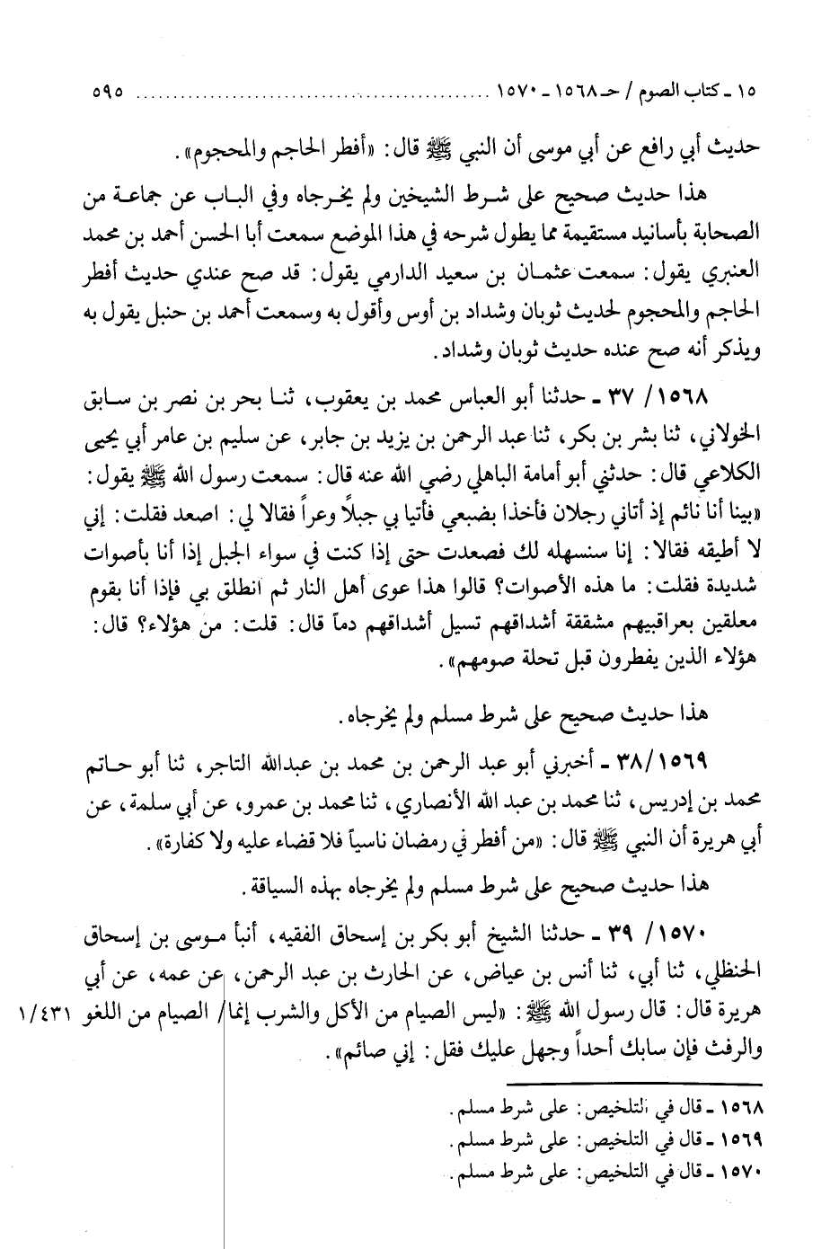 1570 - حَدَّثَنَا الشَّيْخُ أَبُو بَكْرِ بْنُ إِسْحَاقَ الْفَقِيهُ، أَنْبَأَ مُوسَى بْنُ إِسْحَاقَ الْحَنْظَلِيُّ، ثنا أَبِي، ثنا أَنَسُ بْنُ عِيَاضٍ، عَنِ الْحَارِثِ بْنِ عَبْدِ الرَّحْمَنِ، عَنْ عَمِّهِ، عَنْ أَبِي هُرَيْرَةَ، قَالَ: قَالَ رَسُولُ اللَّهِ صَلَّى اللهُ عَلَيْهِ وَسَلَّمَ: §" لَيْسَ الصِّيَامُ مِنَ الْأَكْلِ وَالشُّرْبِ إِنَّمَا الصِّيَامُ مِنَ اللَّغْوِ وَالرَّفَثِ، فَإِنْ سَابَّكَ أَحَدٌ، وَجَهِلَ عَلَيْكَ فَقُلْ: إِنِّي صَائِمٌ «هَذَا حَدِيثٌ صَحِيحٌ عَلَى شَرْطِ مُسْلِمٍ، وَلَمْ يُخَرِّجَاهُ»