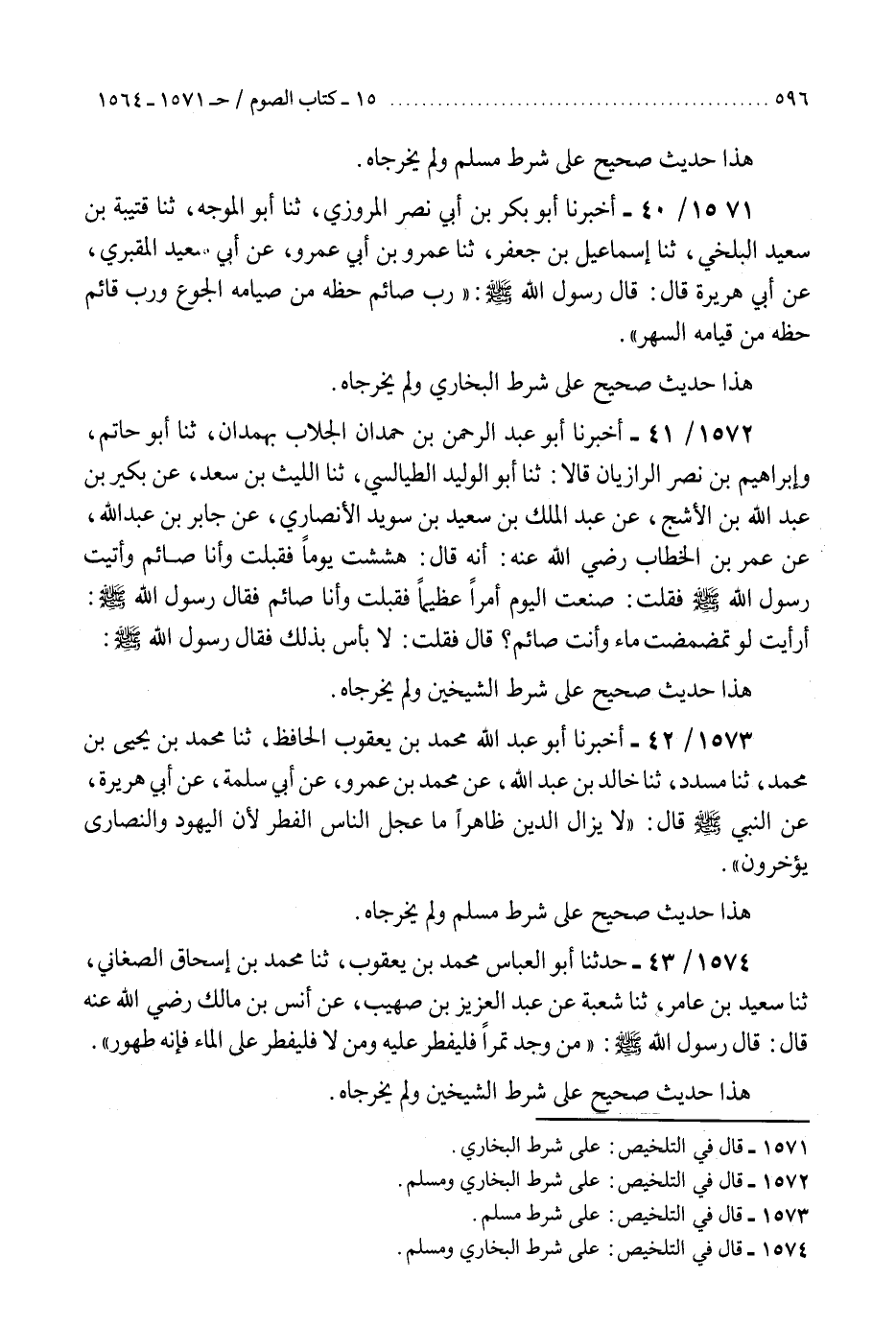 1572 - أَخْبَرَنَا أَبُو عَبْدِ الرَّحْمَنِ بْنُ حَمْدَانَ الْجَلَّابُ بِهَمْدَانَ، ثنا أَبُو حَاتِمٍ، وَإِبْرَاهِيمُ بْنُ نَصْرٍ الرَّازِيَانِ، قَالَا: ثنا أَبُو الْوَلِيدِ الطَّيَالِسِيُّ، ثنا اللَّيْثُ بْنُ سَعْدٍ، عَنْ بُكَيْرِ بْنِ عَبْدِ اللَّهِ بْنِ الْأَشَجِّ، عَنْ عَبْدِ الْمَلِكِ بْنِ سَعِيدِ بْنِ سُوَيْدٍ الْأَنْصَارِيِّ، عَنْ جَابِرِ بْنِ عَبْدِ اللَّهِ، عَنْ عُمَرَ بْنِ الْخَطَّابِ، رَضِيَ اللَّهُ عَنْهُ أَنَّهُ قَالَ: هَشَشْتُ يَوْمًا فَقَبَّلْتُ وَأَنَا صَائِمٌ، وَأَتَيْتُ رَسُولَ اللَّهِ صَلَّى اللهُ عَلَيْهِ وَسَلَّمَ فَقُلْتُ: صَنَعْتُ الْيَوْمَ أَمْرًا عَظِيمًا §فَقَبَّلْتُ وَأَنَا صَائِمٌ، فَقَالَ رَسُولُ اللَّهِ صَلَّى اللهُ عَلَيْهِ وَسَلَّمَ: «أَرَأَيْتَ لَوْ تَمَضْمَضْتَ مَاءً وَأَنْتَ صَائِمٌ؟» قَالَ: فَقُلْتُ: لَا بَأْسَ بِذَلِكَ، فَقَالَ رَسُولُ اللَّهِ صَلَّى اللهُ عَلَيْهِ وَسَلَّمَ: «هَذَا» حَدِيثٌ صَحِيحٌ عَلَى شَرْطِ الشَّيْخَيْنِ، وَلَمْ يُخَرِّجَاهُ "