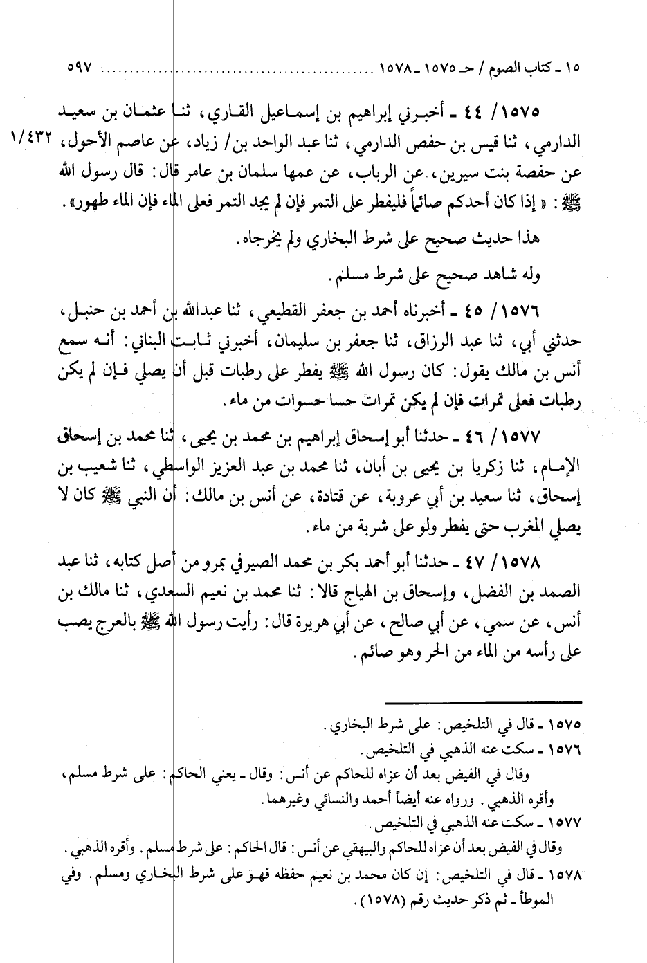1575 - أَخْبَرَنِي إِبْرَاهِيمُ بْنُ إِسْمَاعِيلَ الْقَارِيُّ، ثنا عُثْمَانُ بْنُ سَعِيدٍ الدَّارِمِيُّ، ثنا قَيْسُ بْنُ حَفْصٍ الدَّارِمِيُّ، ثنا عَبْدُ الْوَاحِدِ بْنُ زِيَادٍ، عَنْ عَاصِمٍ الْأَحْوَلِ، عَنْ حَفْصَةَ بِنْتِ سِيرِينَ، عَنِ الرَّبَابِ، عَنْ عَمِّهَا سَلْمَانَ بْنِ عَامِرٍ، قَالَ: قَالَ رَسُولُ اللَّهِ صَلَّى اللهُ عَلَيْهِ وَسَلَّمَ: «§إِذَا كَانَ أَحَدُكُمْ صَائِمًا فَلْيُفْطِرْ عَلَى التَّمْرِ، فَإِنْ لَمْ يَجِدِ التَّمْرَ فَعَلَى الْمَاءِ، فَإِنَّهُ الْمَاءُ طَهُورُ» هَذَا حَدِيثٌ صَحِيحٌ عَلَى شَرْطِ الْبُخَارِيِّ، وَلَمْ يُخَرِّجَاهُ، وَلَهُ شَاهِدٌ صَحِيحٌ عَلَى شَرْطِ مُسْلِمٍ "