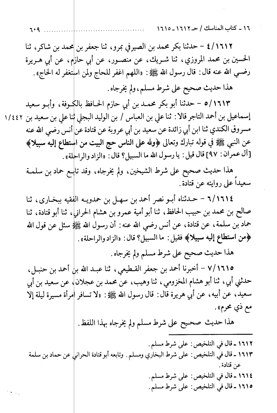1613 - حَدَّثَنَا أَبُو بَكْرٍ مُحَمَّدُ بْنُ أَبِي حَازِمٍ الْحَافِظُ بِالْكُوفَةِ، وَأَبُو سَعِيدٍ إِسْمَاعِيلُ بْنُ أَحْمَدَ التَّاجِرُ، قَالَا: ثنا عَلِيُّ بْنُ الْعَبَّاسِ بْنِ الْوَلِيدِ الْبَجَلِيُّ، ثنا عَلِيُّ بْنُ سَعِيدِ بْنِ مَسْرُوقٍ الْكِنْدِيُّ، ثنا ابْنُ أَبِي زَائِدَةَ، عَنْ سَعِيدِ بْنِ أَبِي عَرُوبَةَ، عَنْ قَتَادَةَ، عَنْ أَنَسٍ، رَضِيَ اللَّهُ عَنْهُ، عَنِ النَّبِيِّ صَلَّى اللهُ عَلَيْهِ وَسَلَّمَ فِي قَوْلِهِ تَبَارَكَ وَتَعَالَى: {§وَلِلَّهِ عَلَى النَّاسِ حَجُّ الْبَيْتِ مَنِ اسْتَطَاعَ إِلَيْهِ سَبِيلًا} [آل عمران: 97] قَالَ: قِيلَ: يَا رَسُولَ اللَّهِ مَا السَّبِيلُ؟ قَالَ: «الزَّادُ وَالرَّاحِلَةُ» هَذَا حَدِيثٌ صَحِيحٌ عَلَى شَرْطِ الشَّيْخَيْنِ، وَلَمْ يُخَرِّجَاهُ " وَقَدْ تَابَعَ حَمَّادُ بْنُ سَلَمَةَ سَعِيدًا عَلَى رِوَايَتِهِ، عَنْ قَتَادَةَ