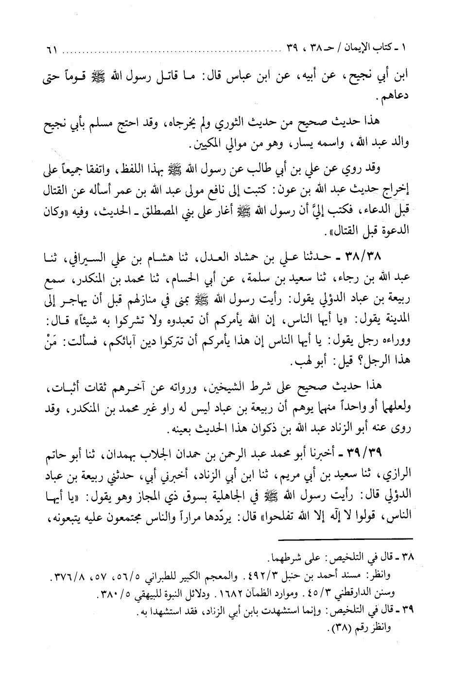 38 - حَدَّثَنَا عَلِيُّ بْنُ حَمْشَاذَ الْعَدْلُ، ثنا هِشَامُ بْنُ عَلِيٍّ السِّيرَافِيُّ، ثنا عَبْدُ اللَّهِ بْنُ رَجَاءٍ، ثنا سَعِيدُ بْنُ سَلَمَةَ بْنِ أَبِي الْحُسَامِ، ثنا مُحَمَّدُ بْنُ الْمُنْكَدِرِ، سَمِعَ رَبِيعَةَ بْنَ عِبَادٍ الدُّؤَلِيَّ يَقُولُ: رَأَيْتُ رَسُولَ اللَّهِ صَلَّى اللهُ عَلَيْهِ وَسَلَّمَ بِمِنًى فِي مَنَازِلِهِمْ قَبْلَ أَنْ يُهَاجِرَ إِلَى الْمَدِينَةِ، يَقُولُ: «يَا أَيُّهَا النَّاسُ، إِنَّ §اللَّهَ يَأْمُرُكُمْ أَنْ تَعْبُدُوهُ وَلَا تُشْرِكُوا بِهِ شَيْئًا» . قَالَ: وَوَرَاءَهُ رَجُلٌ، يَقُولُ: يَا أَيُّهَا النَّاسُ، إِنَّ هَذَا يَأْمُرُكُمْ أَنْ تَتْرُكُوا دَيْنَ آبَائِكُمْ، فَسَأَلْتُ مَنْ هَذَا الرَّجُلُ؟ قِيلَ: أَبُو لَهَبٍ. «هَذَا حَدِيثٌ صَحِيحٌ عَلَى شَرْطِ الشَّيْخَيْنِ، وَرُوَاتُهُ عَنْ آخِرِهِمْ ثِقَاتٌ أَثْبَاتٌ، وَلَعَلَّهُمَا أَوْ وَاحِدًا مِنْهُمَا يُوهِمُ أَنَّ رَبِيعَةَ بْنَ عَبَّادٍ لَيْسَ لَهُ رَاوٍ غَيْرُ مُحَمَّدِ بْنِ الْمُنْكَدِرِ، وَقَدْ رَوَى عَنْهُ أَبُو الزِّنَادِ عَبْدُ اللَّهِ بْنُ ذَكْوَانَ هَذَا الْحَدِيثَ بِعَيْنِهِ» K38 - على شرطهما