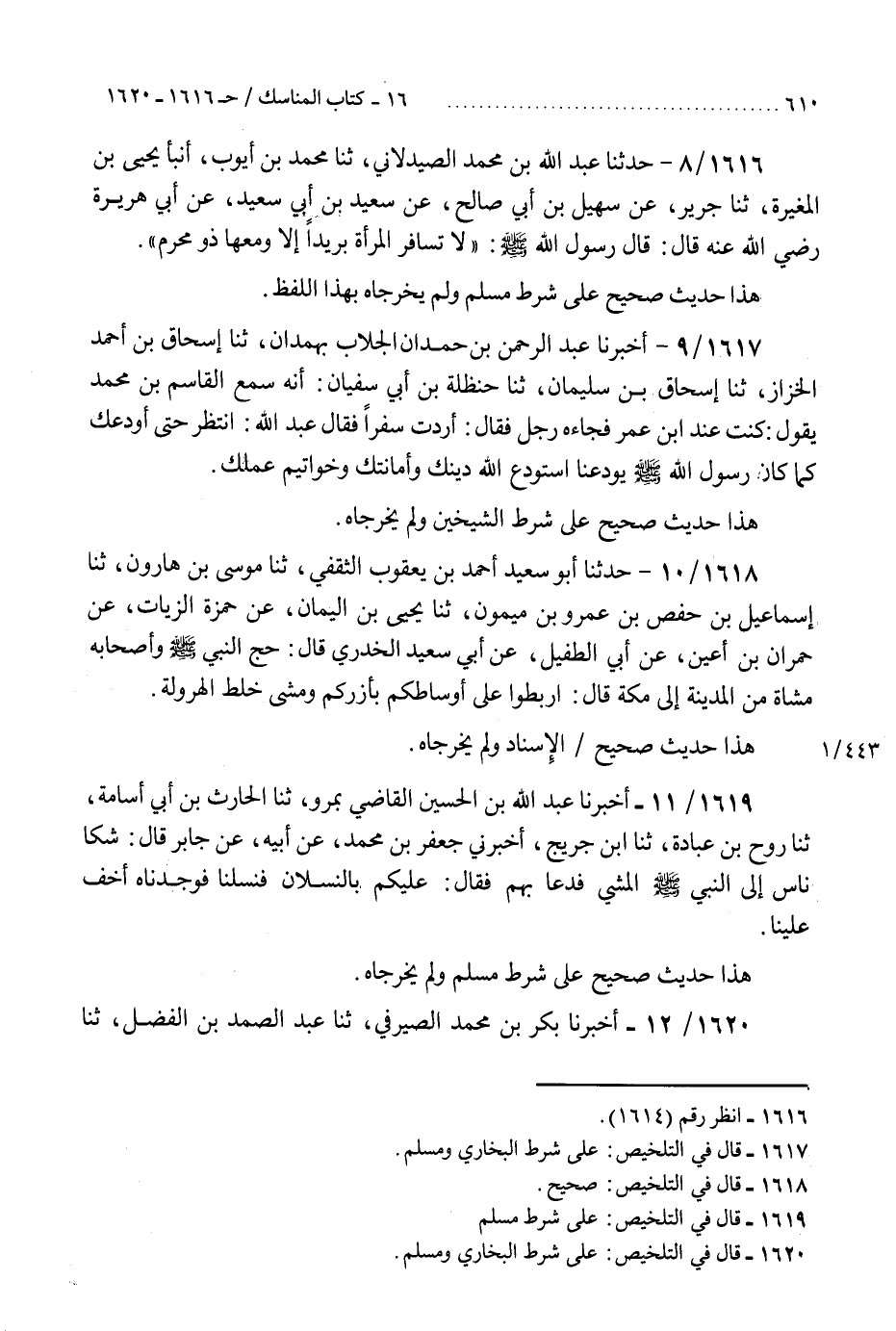1616 - حَدَّثَنَا عَبْدُ اللَّهِ بْنُ مُحَمَّدٍ الصَّيْدَلَانِيُّ، ثنا مُحَمَّدُ بْنُ أَيُّوبَ، أَنْبَأَ يَحْيَى بْنُ الْمُغِيرَةِ، ثنا جَرِيرٌ، عَنْ سُهَيْلِ بْنِ أَبِي صَالِحٍ، عَنْ سَعِيدِ بْنِ أَبِي سَعِيدٍ، عَنْ أَبِي هُرَيْرَةَ، رَضِيَ اللَّهُ عَنْهُ، قَالَ: قَالَ رَسُولُ اللَّهِ صَلَّى اللهُ عَلَيْهِ وَسَلَّمَ: §«لَا تُسَافِرُ الْمَرْأَةُ بَرِيدًا إِلَّا وَمَعَهَا ذُو مَحْرَمٍ» هَذَا حَدِيثٌ صَحِيحٌ عَلَى شَرْطِ مُسْلِمٍ، وَلَمْ يُخَرِّجَاهُ بِهَذَا اللَّفْظِ "