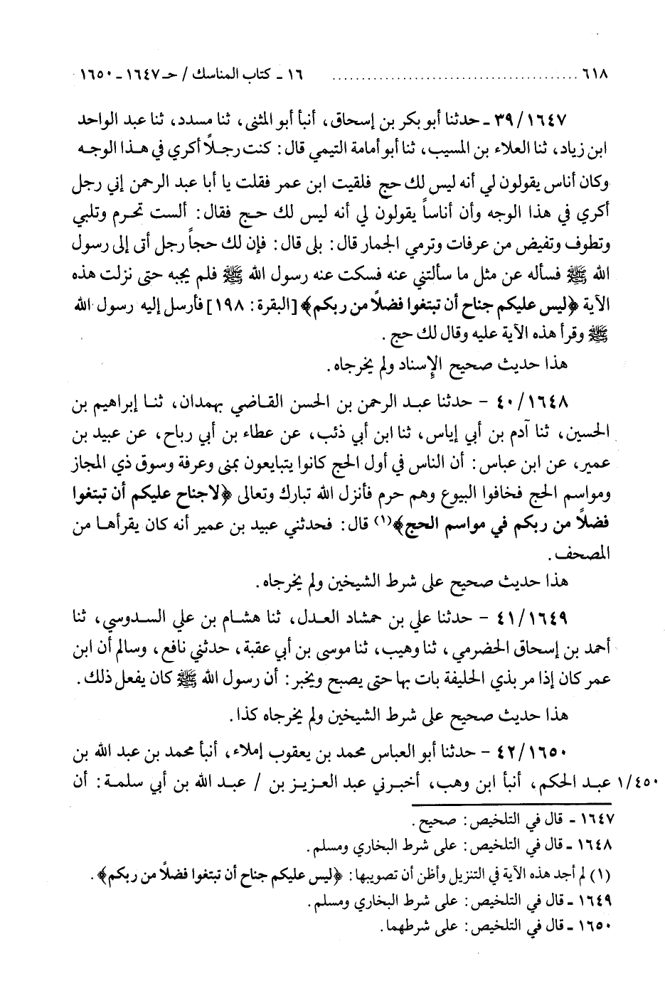 1647 - حَدَّثَنَا أَبُو بَكْرِ بْنُ إِسْحَاقَ، أَنْبَأَ أَبُو الْمُثَنَّى، ثنا مُسَدَّدٌ، ثنا عَبْدُ الْوَاحِدِ بْنُ زِيَادٍ، ثنا الْعَلَاءُ بْنُ الْمُسَيَّبٍ، ثنا أَبُو أُمَامَةَ التَّيْمِيُّ، قَالَ: كُنْتُ رَجُلًا أُكْرِي فِي هَذَا الْوَجْهِ، وَكَانَ أُنَاسٌ يَقُولُونَ لِي: إِنَّهُ لَيْسَ لَكَ حَجٌّ، فَلَقِيتُ ابْنَ عُمَرَ فَقُلْتُ، يَا أَبَا عَبْدِ الرَّحْمَنِ إِنِّي رَجُلٌ أُكْرِي فِي هَذَا الْوَجْهِ، وَإِنَّ أُنَاسًا يَقُولُونَ لِي: إِنَّهُ لَيْسَ لَكَ حَجٌّ، فَقَالَ: أَلَسْتَ تُحْرِمُ، وَتُلَبِّي، وَتَطُوفُ، وَتُفِيضُ مِنْ عَرَفَاتٍ، وَتَرْمِي الْجِمَارَ؟ قَالَ: بَلَى. قَالَ: فَإِنَّ لَكَ حَجًّا، رَجُلٌ أَتَى إِلَى رَسُولِ اللَّهِ صَلَّى اللهُ عَلَيْهِ وَسَلَّمَ فَسَأَلَهُ عَنْ مِثْلِ مَا سَأَلْتَنِي عَنْهُ، فَسَكَتَّ عَنْهُ رَسُولُ اللَّهِ صَلَّى اللهُ عَلَيْهِ وَسَلَّمَ فَلَمْ يُجِبْهُ حَتَّى نَزَلَتْ هَذِهِ الْآيَةُ: {§لَيْسَ عَلَيْكُمْ جُنَاحٌ أَنْ تَبْتَغُوا فَضْلًا مِنْ رَبِّكُمْ} [البقرة: 198] فَأَرْسَلَ إِلَيْهِ رَسُولُ اللَّهِ صَلَّى اللهُ عَلَيْهِ وَسَلَّمَ وَقَرَأَ هَذِهِ الْآيَةَ عَلَيْهِ، وَقَالَ: «لَكَ حَجٌّ» هَذَا حَدِيثٌ صَحِيحُ الْإِسْنَادِ، وَلَمْ يُخَرِّجَاهُ "