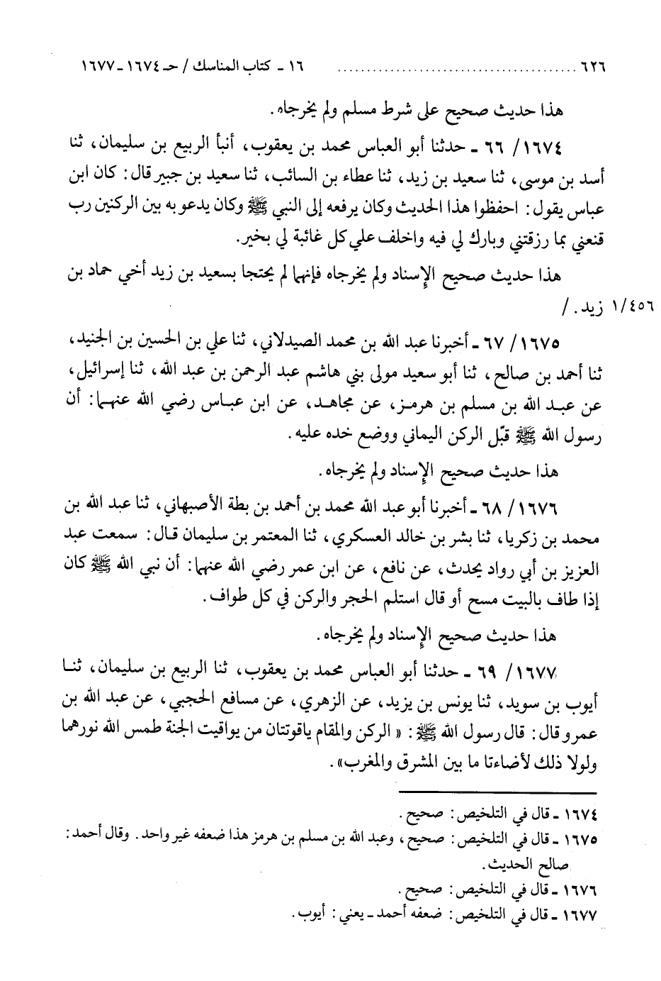 1676 - أَخْبَرَنَا أَبُو عَبْدِ اللَّهِ مُحَمَّدُ بْنُ أَحْمَدَ بْنِ بَطَّةَ الْأَصْبَهَانِيُّ، ثنا عَبْدُ اللَّهِ بْنُ مُحَمَّدِ بْنِ زَكَرِيَّا، ثنا بِشْرُ بْنُ خَالِدٍ الْعَسْكَرِيُّ، ثنا الْمُعْتَمِرُ بْنُ سُلَيْمَانَ، قَالَ: سَمِعْتُ عَبْدَ الْعَزِيزِ بْنَ أَبِي رَوَّادٍ، يُحَدِّثُ عَنْ نَافِعٍ، عَنِ ابْنِ عُمَرَ، رَضِيَ اللَّهُ عَنْهُمَا، " أَنَّ نَبِيَّ اللَّهِ صَلَّى اللهُ عَلَيْهِ وَسَلَّمَ كَانَ §إِذَا طَافَ بِالْبَيْتِ مَسَحَ - أَوْ قَالَ: اسْتَلَمَ - الْحَجَرَ وَالرُّكْنَ فِي كُلِّ طَوَافٍ «هَذَا حَدِيثٌ صَحِيحُ الْإِسْنَادِ، وَلَمْ يُخَرِّجَاهُ»